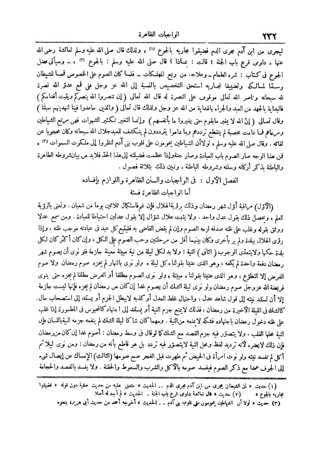 وقال صلى الله عليه وسلم لولا أن الشياطين يحومون على قلوب بني آدم لنظروا إلى ملكوت السموات (¬3) فَمِنْ هَذَا الْوَجْهِ صَارَ الصَّوْمُ بَابَ الْعِبَادَةِ وَصَارَ جُنَّةً وَإِذَا عَظُمَتْ فَضِيلَتُهُ إِلَى هَذَا الْحَدِّ فَلَا بُدَّ مِنْ بَيَانِ شُرُوطِهِ الظَّاهِرَةِ والباطنة بذكر أركانه وسننه وشروطه الباطنة ونبين ذلك بثلاثة فصول