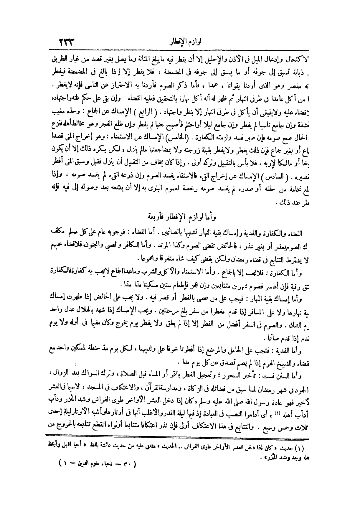 الْقَضَاءُ وَالْكَفَّارَةُ وَالْفِدْيَةُ وَإِمْسَاكُ بَقِيَّةِ النَّهَارِ تشبيهاً بِالصَّائِمِينَ