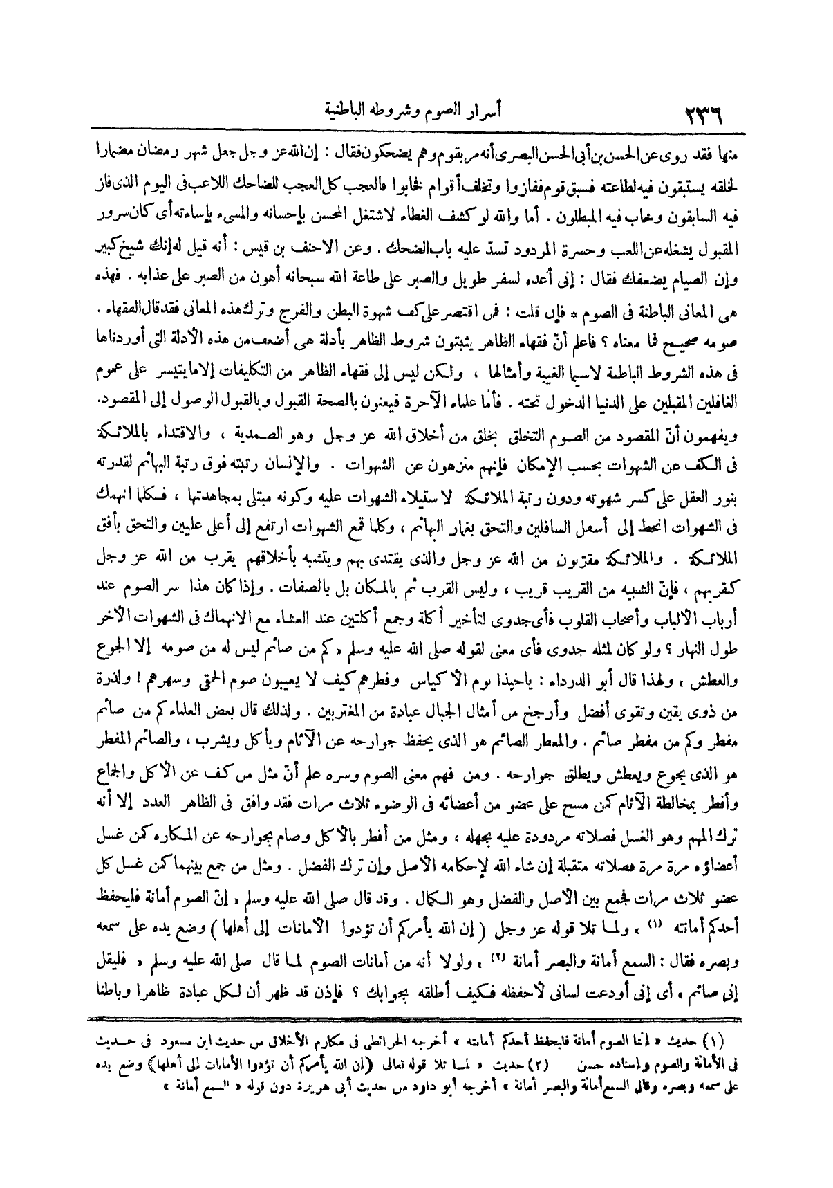 ومثل من جمع بينهما كمن غسل كل عضو ثلاث مرات فجمع بين الأصل والفضل وهو الكمال وقد قال صلى الله عليه وسلم إن الصوم أمانة فليحفظ أحدكم أمانته (¬1) ولما تلا قوله عز وجل إن الله يأمركم أن تؤدوا الأمانات إلى أهلها وضع يده على سمعه وبصره فقال السمع أمانة والبصر أمانة (¬2) ولولا أنه من أمانات الصوم لما قال صلى الله عليه وسلم فليقل إني صائم أي إني أودعت لساني لأحفظه فكيف أطلقه بجوابك فإذن قد ظهر أن لكل عبادة ظاهراً وباطنا
