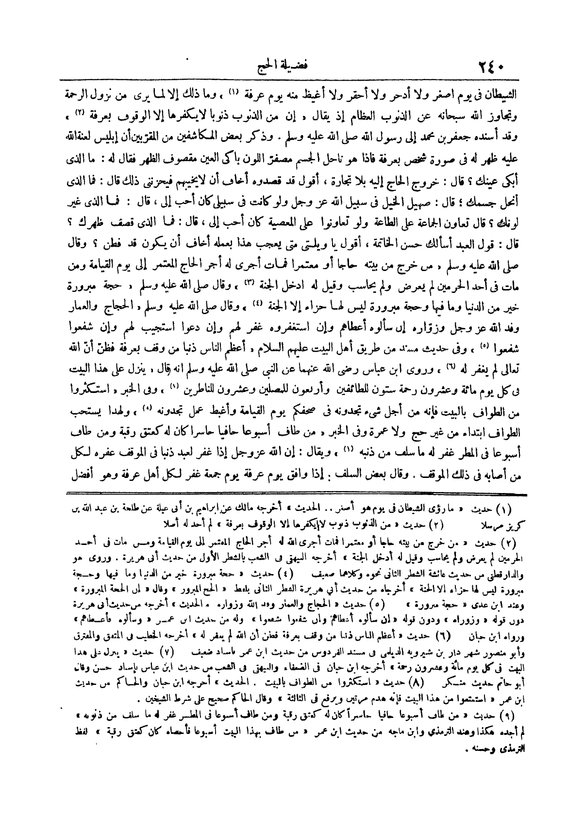الشيطان في يوم أصغر ولا أدحر ولا أحقر ولا أغيظ منه يوم عرفة (¬1) وما ذلك إلا لما يرى من نزول الرحمة وتجاوز الله سبحانه عن الذنوب العظام إذ يقال إن من الذنوب ذنوباً لا يكفرها إلا الوقوف بعرفة (¬2) وقد أسنده جعفر بن محمد إِلَى رَسُولِ اللَّهِ صَلَّى اللَّهُ عَلَيْهِ وَسَلَّمَ