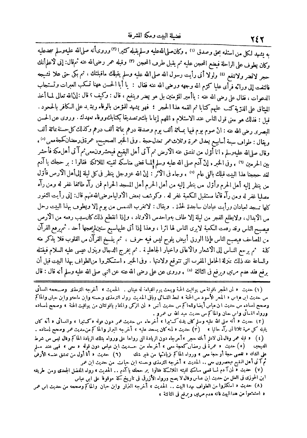 به يشهد لكل من استلمه بحق وصدق (¬1) وكان صلى الله عليه وسلم يقبله كثيراً (¬2) وروي أنه صلى الله عليه وسلم سجد عليه وكان يطوف على الراحلة فيضع المحجن عليه ثم يقبل طرف المحجن (¬3) وقبله عمر رضي الله عنه ثم قال إني لأعلم أنك حجر لا تضر ولا تنفع (¬4) ولولا أني رأيت رسول الله صلى الله عليه وسلم يقبلك ما قبلتك ثم بكى حتى علا نشيجه فالتفت إلى ورائه فرأى علياً كرم الله وجهه ورضي الله عنه فقال يا أبا الحسن ههنا تسكب العبرات وتستجاب الدعوات فقال علي رضي الله عنه يا أمير المؤمنين بل هو يضر وينفع قال وكيف قال إن الله تعالى لما أخذ الميثاق على الذرية كتب عليهم كتاباً ثم ألقمه هذا الحجر فهو يشهد للمؤمن بالوفاء ويشهد على الكافر بالجحود قيل فذلك هو معنى قول الناس عند الاستلام اللَّهُمَّ إِيمَانًا بِكَ وَتَصْدِيقًا بِكِتَابِكَ وَوَفَاءً بِعَهْدِكَ