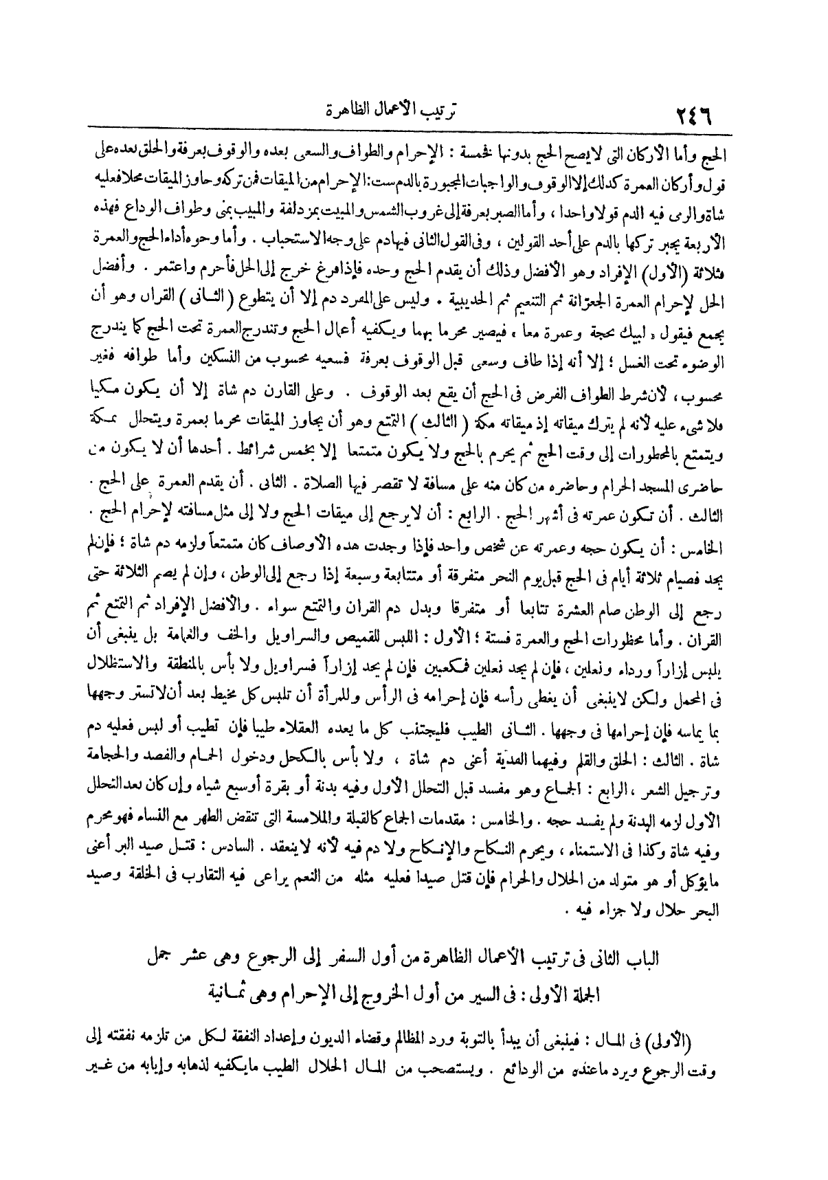 الباب الثاني في تَرْتِيبُ الْأَعْمَالِ الظَّاهِرَةِ مِنْ أَوَّلِ السَّفَرِ إِلَى الرُّجُوعِ وَهِيَ عَشْرُ جُمَلٍ