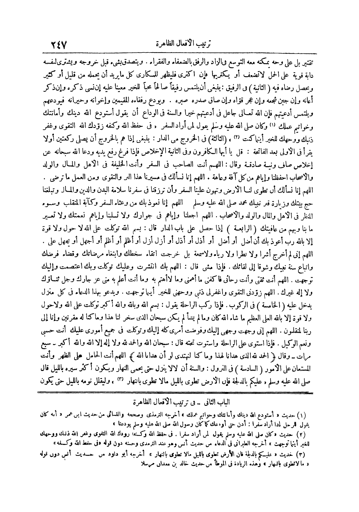 الثَّالِثَةُ فِي الْخُرُوجِ مِنَ الدَّارِ يَنْبَغِي إِذَا هَمَّ بِالْخُرُوجِ أَنْ يُصَلِّيَ رَكْعَتَيْنِ أولاً يقرأ في الأولى بعد الفاتحة قل يا أيها الكافرون وفي الثانية الإخلاص فإذا فرغ رفع يديه ودعا الله سبحانه عن إخلاص صاف ونية صادقة وقال اللهم أنت الصاحب في السفر وأنت الخليفة فِي الْأَهْلِ وَالْمَالِ وَالْوَلَدِ وَالْأَصْحَابِ احْفَظْنَا وَإِيَّاهُمْ مِنْ كُلِّ آفَةٍ وَعَاهَةٍ اللَّهُمَّ إِنَّا نَسْأَلُكَ فِي مَسِيرِنَا هَذَا الْبِرَّ وَالتَّقْوَى وَمِنَ الْعَمَلِ ما ترضى اللهم إنا نسألك أن تطوي لنا الأرض وتهون علينا السفر وأن ترزقنا في سفرنا سلامة البدن والدين والمال وتبلغنا حج بيتك وزيارة قبر نبيك محمد صلى الله عليه وسلم اللَّهُمَّ إِنَّا نَعُوذُ بِكَ مِنْ وَعْثَاءِ السَّفَرِ وكآبة المنظر وسوء المنقلب في الأهل والمال والولد والأصحاب اللهم اجعلنا وإياهم في جوارك ولا تسلبنا وإياهم نعمتك ولا تغير ما بنا وبهم من عافيتك