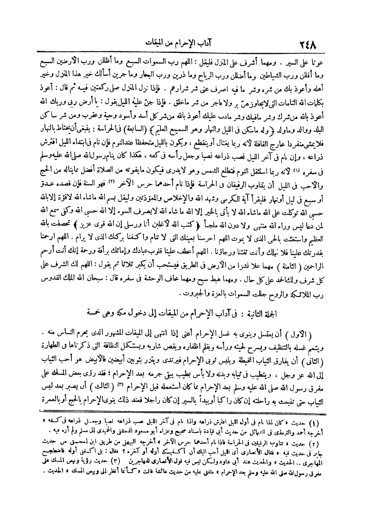 السابعة في الحراسة ينبغي أن يحتاط بالنهار فلا يمشي منفرداً خارج القافلة لِأَنَّهُ رُبَّمَا يُغْتَالُ أَوْ يَنْقَطِعُ وَيَكُونُ بِاللَّيْلِ متحفظاً عند النوم فإن نام في ابتداء الليل افترش ذراعه وإن نام في آخر الليل نصب ذراعه نصباً وجعل رأسه في كفه هكذا كان ينام رسول الله صلى الله عليه وسلم في سفره (¬1) لأنه ربما استثقل النوم فتطلع الشمس وهو لا يدري فيكون ما يفوته من الصلاة أفضل مما يناله من الحج والأحب في الليل أن يتناوب الرفيقان في الحراسة فإن نام أحدهما حرس الآخر (¬2) فهو السنة فإن قصده عدو أو سبع في ليل أو نهار فليقرأ آية الكرسي وشهد الله والإخلاص والمعوذتين وليقل بسم الله ما شاء الله لا قوة إلا بالله حسبي الله توكلت على الله ما شاء الله لا يأتي بالخير إلا الله ما شاء الله لا يصرف السوء إلا الله حسبي الله وكفى سمع الله لمن دعا ليس وراء الله منتهى ولا دون الله ملجأ كتب الله لأغلبن أنا ورسلي إن الله قوي عزيز تحصنت بالله العظيم واستغثت بالحي الذي لا يموت اللهم احرسنا بعينك التي لا تنام واكنفنا بركنك الذي لا يرام اللهم ارحمنا بقدرتك علينا فلا نهلك وأنت ثقتنا ورجاؤنا اللهم أعطف علينا قلوب عبادك وإمائك برأفة ورحمة إنك أنت أرحم الراحمين