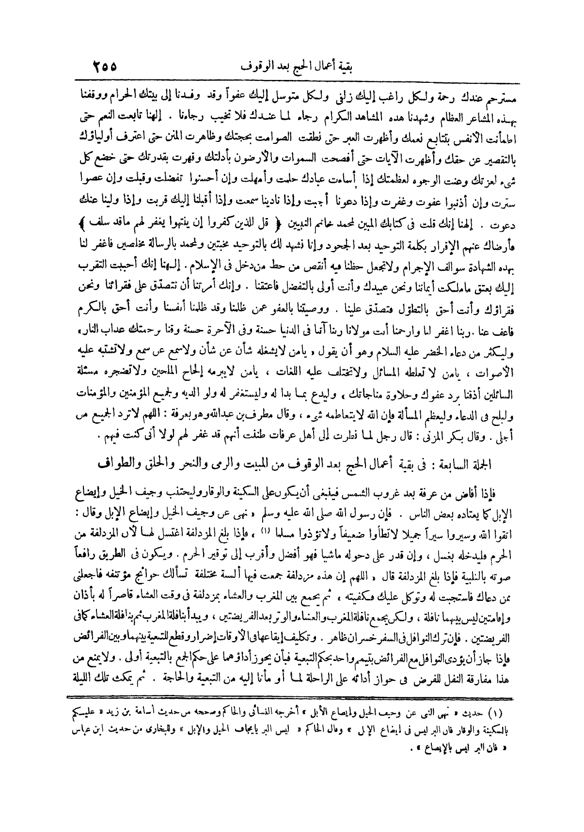 فإذا أَفَاضَ مِنْ عَرَفَةَ بَعْدَ غُرُوبِ الشَّمْسِ فَيَنْبَغِي أن يكون على السكينة والوقار وليجتنب وجيف الخيل وإيضاع الإبل كما يعتاده بعض الناس فَإِنَّ رَسُولَ اللَّهِ صَلَّى اللَّهُ عَلَيْهِ وَسَلَّمَ نهى عن وجيف الخيل وإيضاع الإبل وقال اتقوا الله وسيروا سيراً جميلاً لا تطأوا ضعيفاً ولا تؤذوا مسلماً (¬1)