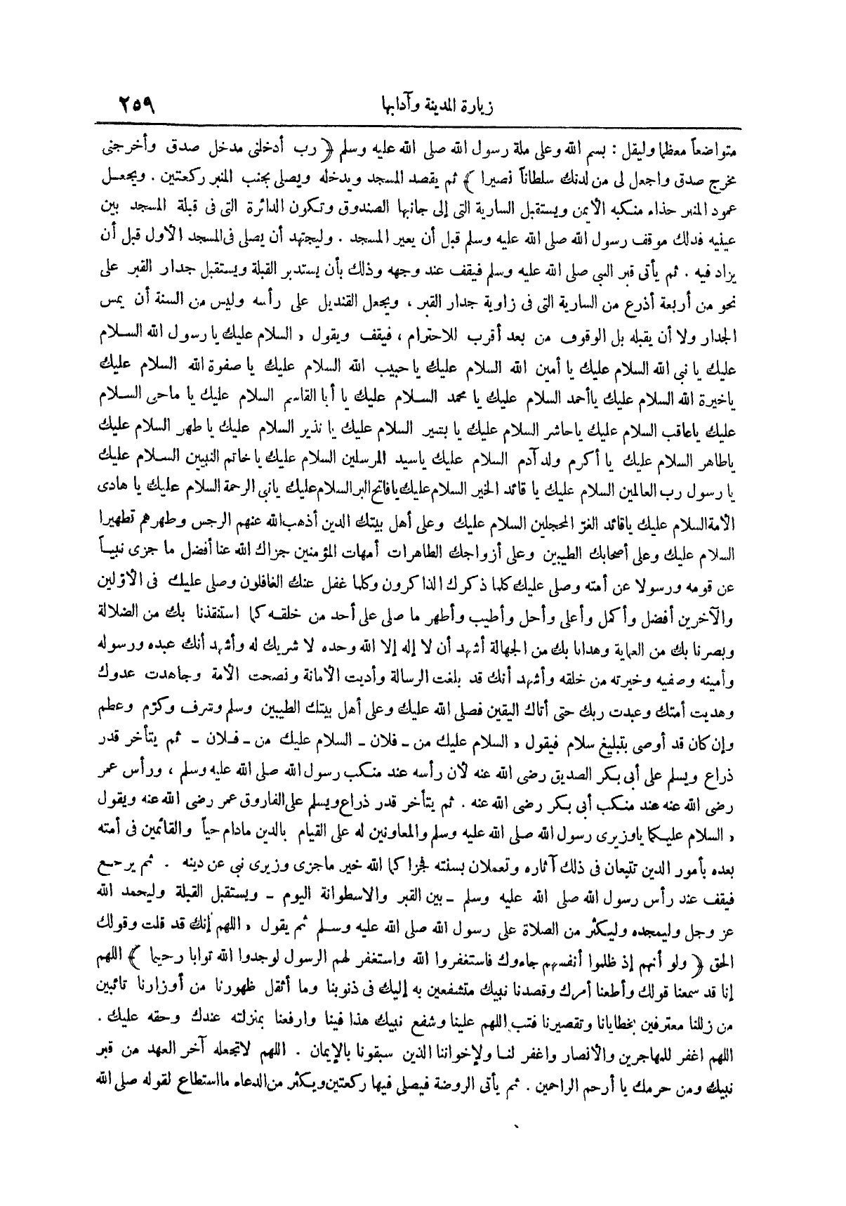 متواضعاً معظماً وليقل بسم الله وعلى ملة رسول الله صلى الله عليه وسلم رب أدخلني مدخل صدق وأخرجني مخرج صدق واجعل لي من لدنك سلطاناً نصيراً ثم يقصد المسجد ويدخله ويصلي بجنب المنبر ركعتين ويجعل عمود المنبر حذاء منكبه الأيمن ويستقبل السارية التي إلى جانبها الصندوق وتكون الدائرة التي في قبلة المسجد بين عينيه فذلك موقف رسول الله صلى الله عليه وسلم قبل أن يغير المسجد وليجتهد أن يصلي في المسجد الأول قبل أن يزاد فيه ثُمَّ يَأْتِي قَبْرَ النَّبِيِّ صَلَّى اللَّهُ عَلَيْهِ وَسَلَّمَ فَيَقِفُ عِنْدَ وَجْهِهِ وَذَلِكَ بِأَنْ يَسْتَدْبِرَ الْقِبْلَةَ وَيَسْتَقْبِلَ جِدَارَ الْقَبْرِ عَلَى نَحْوٍ مِنْ أَرْبَعَةِ أَذْرُعٍ مِنَ السَّارِيَةِ الَّتِي فِي زَاوِيَةِ جدار القبر ويجعل القنديل على رأسه وَلَيْسَ مِنَ السُّنَّةِ أَنْ يَمَسَّ الْجِدَارَ وَلَا أن يقبله بَلِ الْوُقُوفُ مِنْ بُعْدٍ أَقْرَبُ لِلْإِحْتِرَامِ فَيَقِفُ وَيَقُولُ السَّلَامُ عَلَيْكَ يَا رَسُولَ اللَّهِ السَّلَامُ عَلَيْكَ يَا نَبِيَّ اللَّهِ السَّلَامُ عَلَيْكَ يَا أَمِينَ اللَّهِ السَّلَامُ عَلَيْكَ يَا حَبِيبَ اللَّهِ السَّلَامُ عَلَيْكَ يَا صَفْوَةَ اللَّهِ السَّلَامُ عَلَيْكَ يا خيرة الله السلام عليك يا أحمد السلام السلام عليك يا محمد السَّلَامُ عَلَيْكَ يَا أَبَا الْقَاسِمِ السَّلَامُ عَلَيْكَ يا ماحي السلام عليك يا عاقب السلام عليك يا حاشر السلام عليك يا بشير السلام عليك يا نذير السلام عليك يا طهر السلام عليك يا طاهر السلام عليك يا أكرم ولد آدم السَّلَامُ عَلَيْكَ يَا سَيِّدَ الْمُرْسَلِينَ السَّلَامُ عَلَيْكَ يَا خَاتَمَ النَّبِيِّينَ السَّلَامُ عَلَيْكَ يَا رَسُولَ رَبِّ الْعَالَمِينَ السَّلَامُ عَلَيْكَ يَا قَائِدَ الْخَيْرِ السَّلَامُ عَلَيْكَ يَا فَاتِحَ الْبِرِّ السَّلَامُ عَلَيْكَ يَا نَبِيَّ الرَّحْمَةِ السَّلَامُ عَلَيْكَ يَا هَادِيَ الأمة السلام عليك يا قائد الغر المحجلين السلام عليك وعلى أهل بيتك الذين أذهب الله عنهم الرجس وطهرهم تطهيراً السلام عليك وعلى أصحابك الطيبين وعلى أزواجك الطاهرات أمهات المؤمنين جَزَاكَ اللَّهُ عَنَّا أَفْضَلَ مَا جَزَى نَبِيًّا عَنْ قَوْمِهِ وَرَسُولًا عَنْ أُمَّتِهِ وَصَلَّى عَلَيْكَ كلما ذكرك الذاكرون وكلما غفل عنك الغافلون وصلى عليك في الأولين والآخرين أفضل وأكمل وأعلى وأجل وأطيب وأطهر مَا صَلَّى عَلَى أَحَدٍ مِنْ خَلْقِهِ كَمَا اسْتَنْقَذَنَا بِكَ مِنَ الضَّلَالَةِ وَبَصَّرَنَا بِكَ مِنَ العماية وهدانا بك من الجهالة أشهد أن لَا إِلَهَ إِلَّا اللَّهُ وَحْدَهُ لَا شَرِيكَ له وأشهد أنك عبده ورسوله وأمينه وصفيه وخيرته من خلقه وأشهد أنك قد بَلَّغْتَ الرِّسَالَةَ وَأَدَّيْتَ الْأَمَانَةَ وَنَصَحْتَ الْأُمَّةَ وَجَاهَدْتَ عَدُوَّكَ وَهَدَيْتَ أُمَّتَكَ وَعَبَدْتَ رَبَّكَ حَتَّى أَتَاكَ الْيَقِينُ فَصَلَّى اللَّهُ عَلَيْكَ وَعَلَى أَهْلِ بَيْتِكَ الطيبين وسلم وشرف وكرم وعظم وإن كان قد أوصي بتبليغ سلام فيقول السلام عليك من فلان السلام عليك من فلان