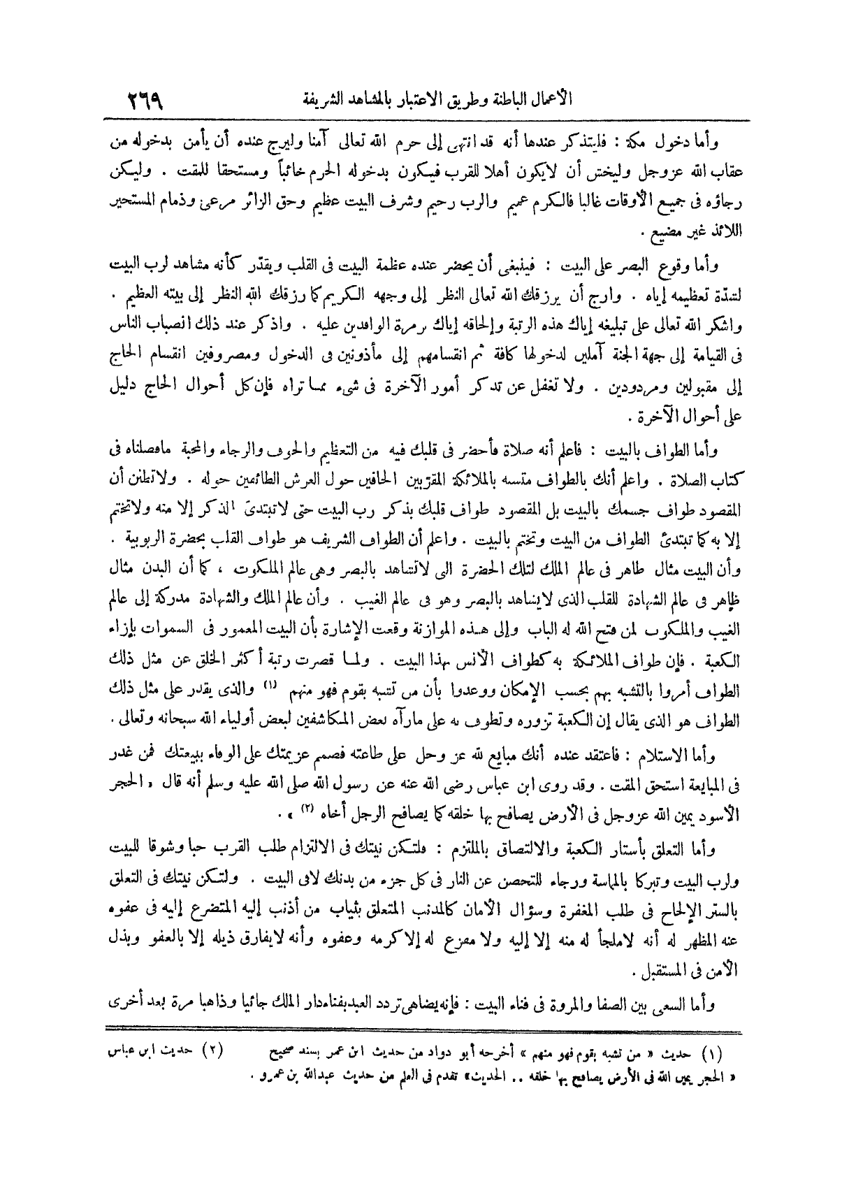 وأما وقوع البصر على البيت فينبغي أن يحضر عنده عظمة البيت في القلب ويقدر كأنه مشاهد لرب البيت لشدة تعظيمه إياه وارج أن يرزقك الله تعالى النظر إلى وجهه الكريم كما رزقك الله النظر إلى بيته العظيم واشكر الله تعالى على تبليغه إياك هذه الرتبة وإلحاقه إياك بزمرة الوافدين عليه واذكر عند ذلك انصباب الناس في القيامة إلى جهة الجنة آملين لدخولها كافة ثم انقسامهم إلى مأذونين في الدخول ومصروفين انقسام الحاج إلى مقبولين ومردودين ولا تغفل عن تذكر أمور الآخرة في شيء مما تراه فإن كل أحوال الحاج دليل على أحوال الآخرة