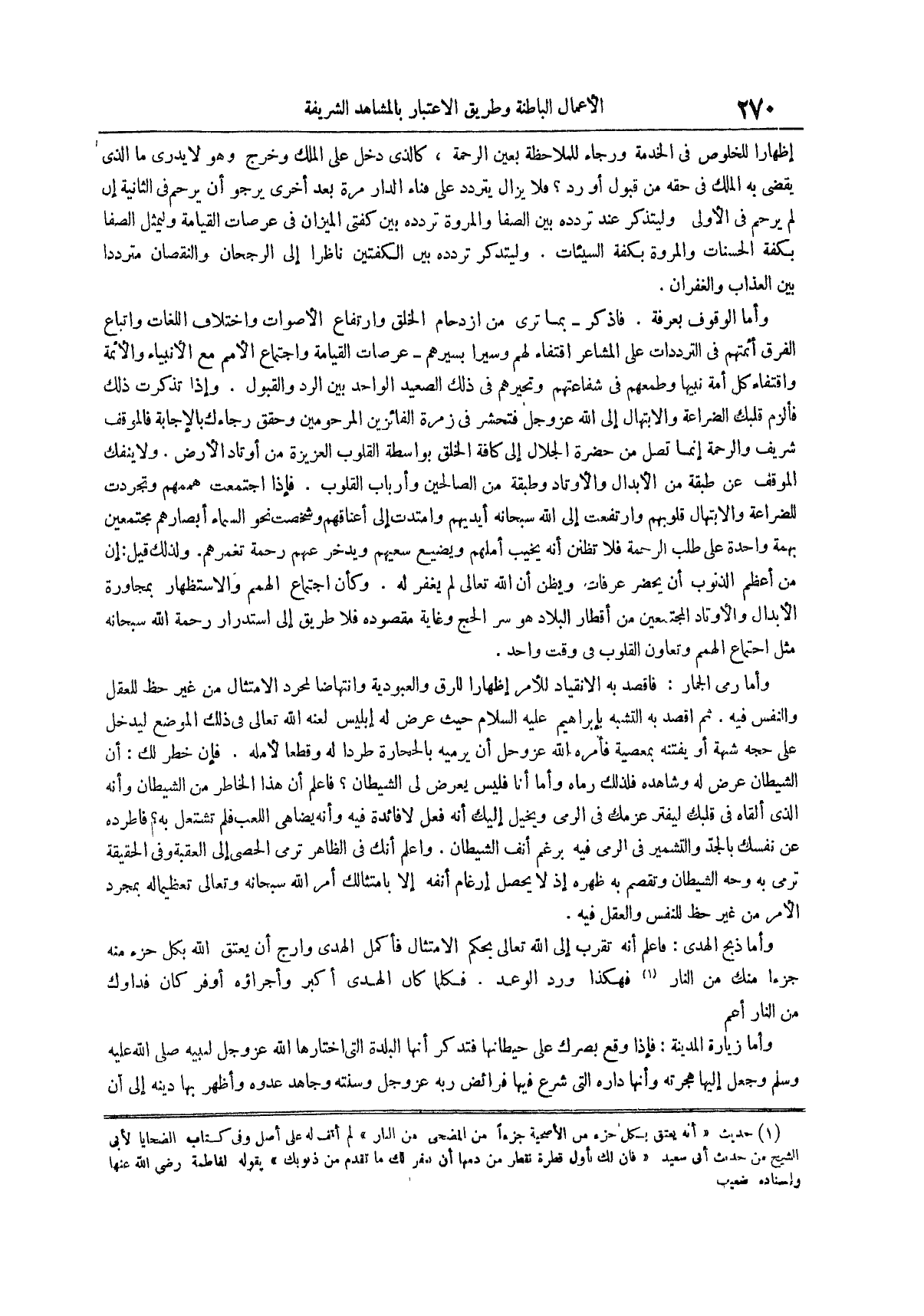 وأما الوقوف بعرفة فاذكر بما ترى من ازدحام الخلق وارتفاع الأصوات وباختلاف اللغات واتباع الفرق أئمتهم في الترددات على المشاعر اقتفاء لهم وسيراً بسيرهم عرصات القيامة واجتماع الأمم مع الأنبياء والأئمة واقتفاء كل أمة نبيها وطمعهم في شفاعتهم وَتَحَيُّرِهِمْ فِي ذَلِكَ الصَّعِيدِ الْوَاحِدِ بَيْنَ الرَّدِّ والقبول وإذا تذكرت ذلك فألزم قلبك الضراعة والابتهال إلى الله عز وجل فتحشر في زمرة الفائزين المرحومين وحقق رجاءك بِالْإِجَابَةِ فَالْمَوْقِفُ شَرِيفٌ وَالرَّحْمَةُ إِنَّمَا تَصِلُ مِنْ حَضْرَةِ الْجَلَالِ إِلَى كَافَّةِ الْخَلْقِ بِوَاسِطَةِ الْقُلُوبِ العزيزة من أوتاد الأرض