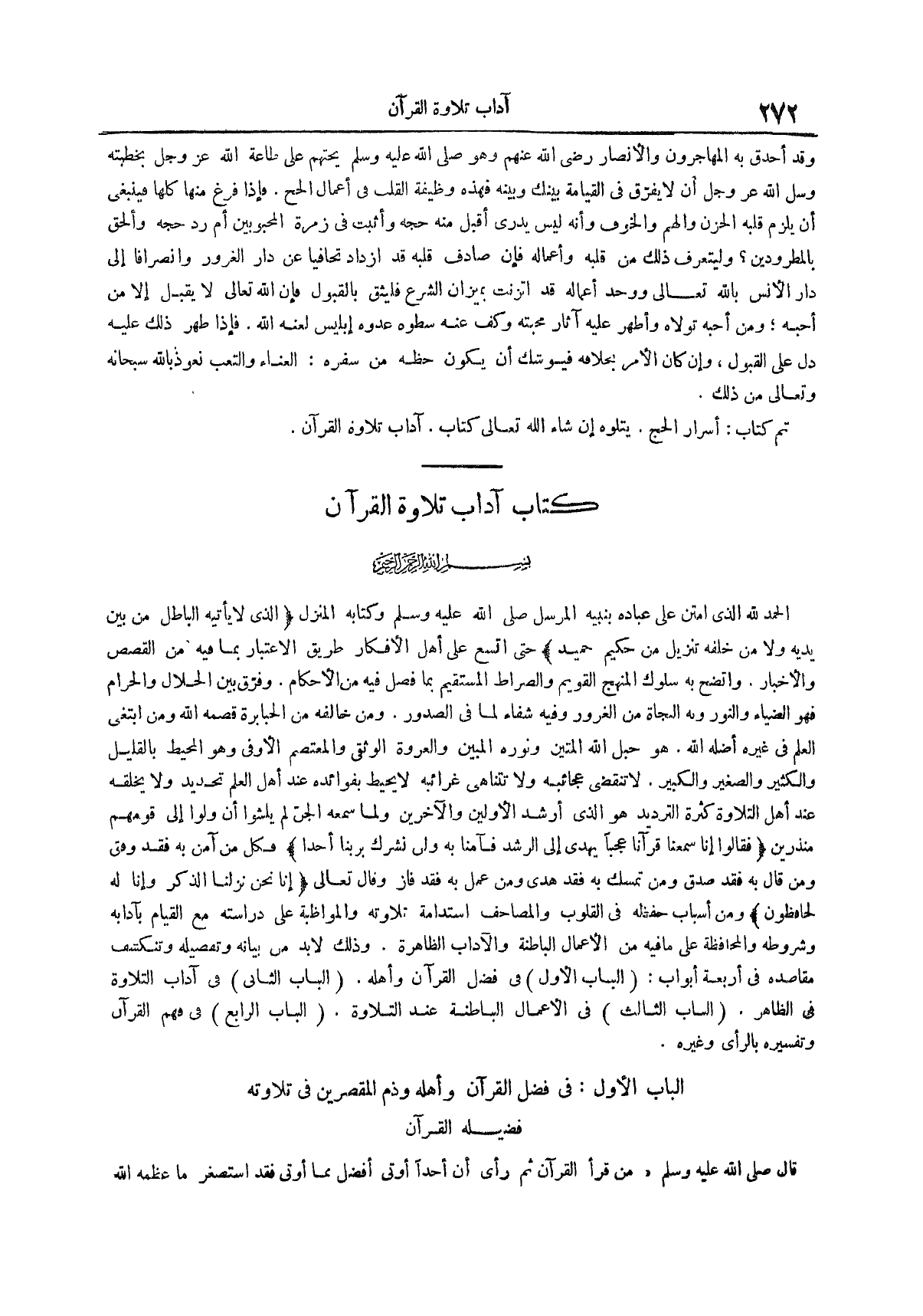 تم كتاب أسرار الحج يتلوه إن شاء الله تعالى كتاب آداب تلاوة القرآن