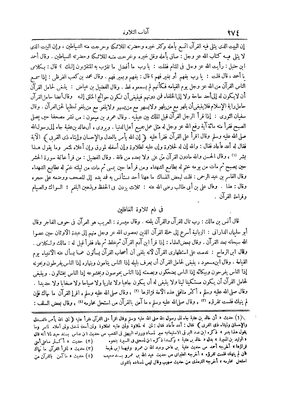 وقال أيضاً حامل القرآن حامل راية الإسلام فلا ينبغي أن يلهو مع من يلهو ولا يسهو مع من يسهو ولا يلغو مع من يلغو تعظيماً لحق القرآن