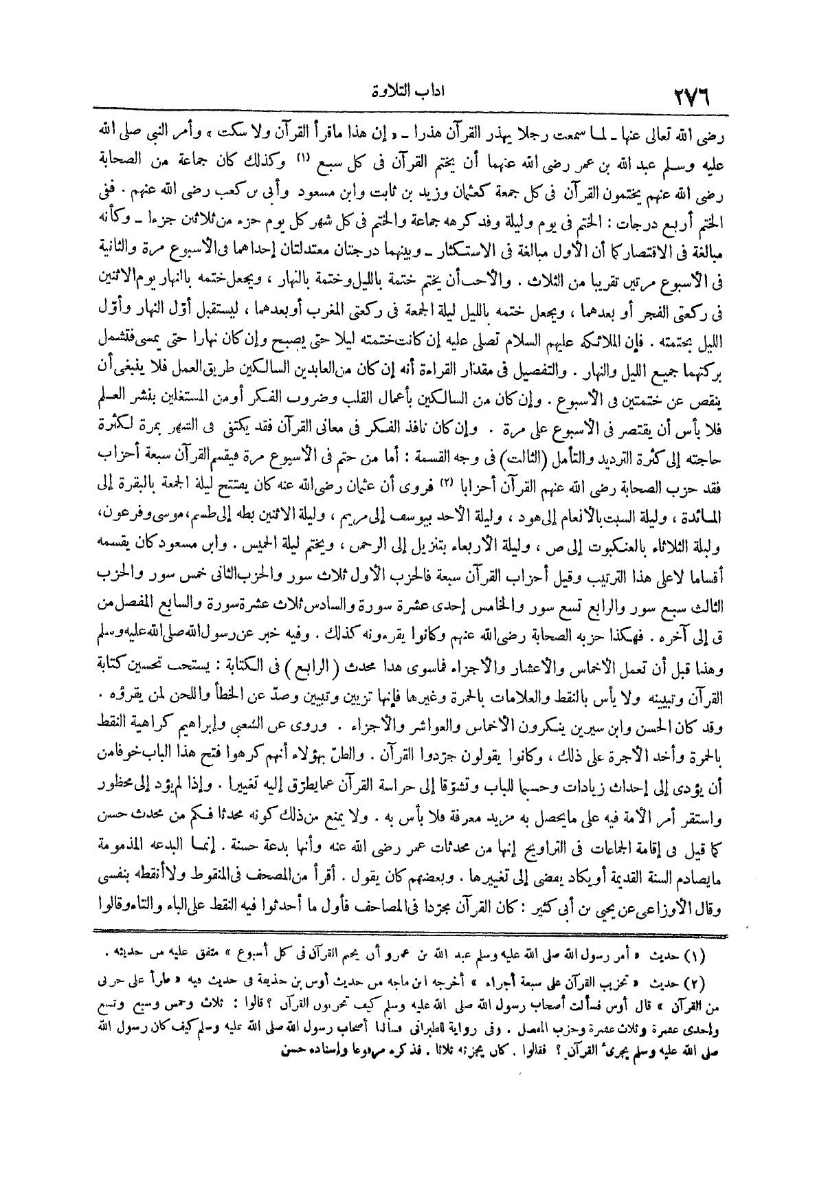 (¬2) حديث تحزيب القرآن على سبعة أجزاء أخرجه ابن ماجه من حديث أوس بن حذيفة في حديث فيه طرأ على حزبي من القرآن قال أوس فسألت أصحاب رسول الله صلى الله عليه وسلم كيف تحزبون القرآن قالوا ثلاث وخمس وسبع وتسع وإحدى عشرة وثلاث عشرة وحزب المفصل وفي رواية للطبراني فسألنا أصحاب رسول الله صلى الله عليه وسلم كيف كَانَ رَسُولُ اللَّهِ صَلَّى اللَّهُ عَلَيْهِ وَسَلَّمَ يجزىء القرآن فقالوا كان يجزئه ثلاثا فذكره مرفوعا وإسناده حسن