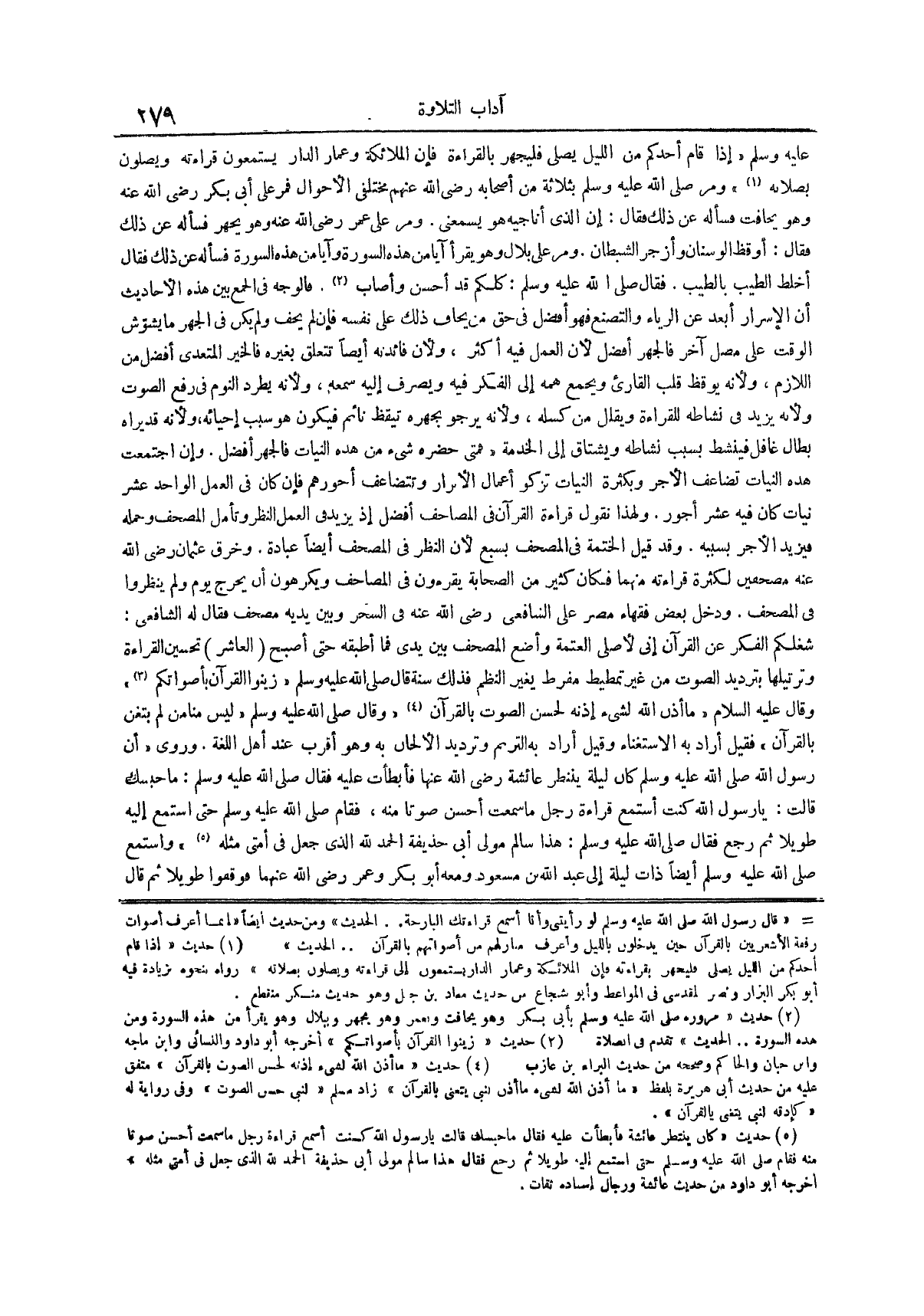 وروي أن رسول الله صلى الله عليه وسلم كان ليلة ينتظر عائشة رضي الله عنها فأبطأت عليه فقال صلى الله عليه وسلم ما حبسك قالت يا رسول الله كنت أستمع قراءة رجل ما سمعت أحسن صوتاً منه فقام صلى الله عليه وسلم حتى استمع إليه طويلاً ثم رجع فقال صلى الله عليه وسلم هذا سالم مولى أبي حذيفة الحمد لله الذي جعل في أمتي مثله (¬5) واستمع صلى الله عليه وسلم أيضاً ذات ليلة إلى عبد الله بن مسعود ومعه أبو بكر وعمر رضي الله عنهما فوقفوا طويلاً ثم قال