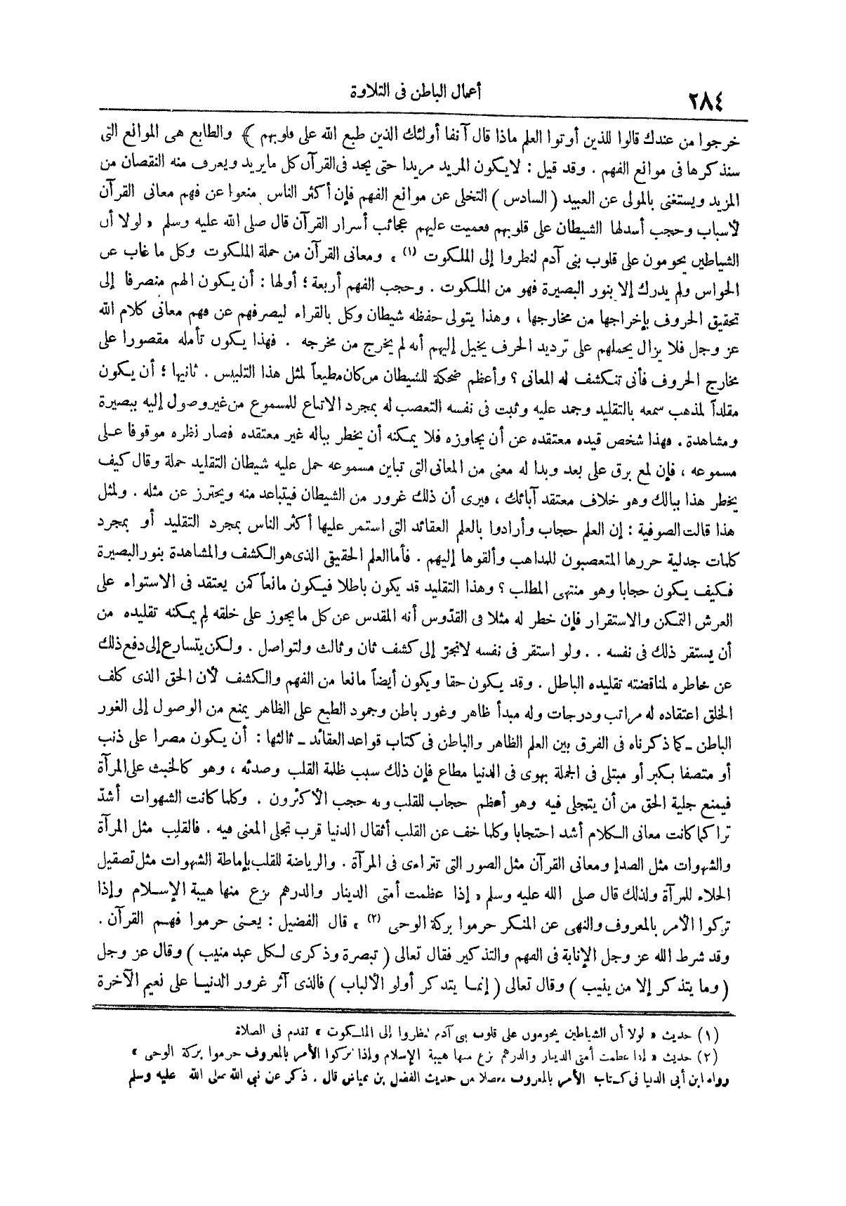 ولمثل هذا قالت الصوفية إن العلم حجاب وأرادوا بالعلم العقائد التي استمر عليها أكثر الناس بمجرد التقليد أو بمجرد كلمات جدلية حررها المتعصبون للمذاهب وألقوها إليهم