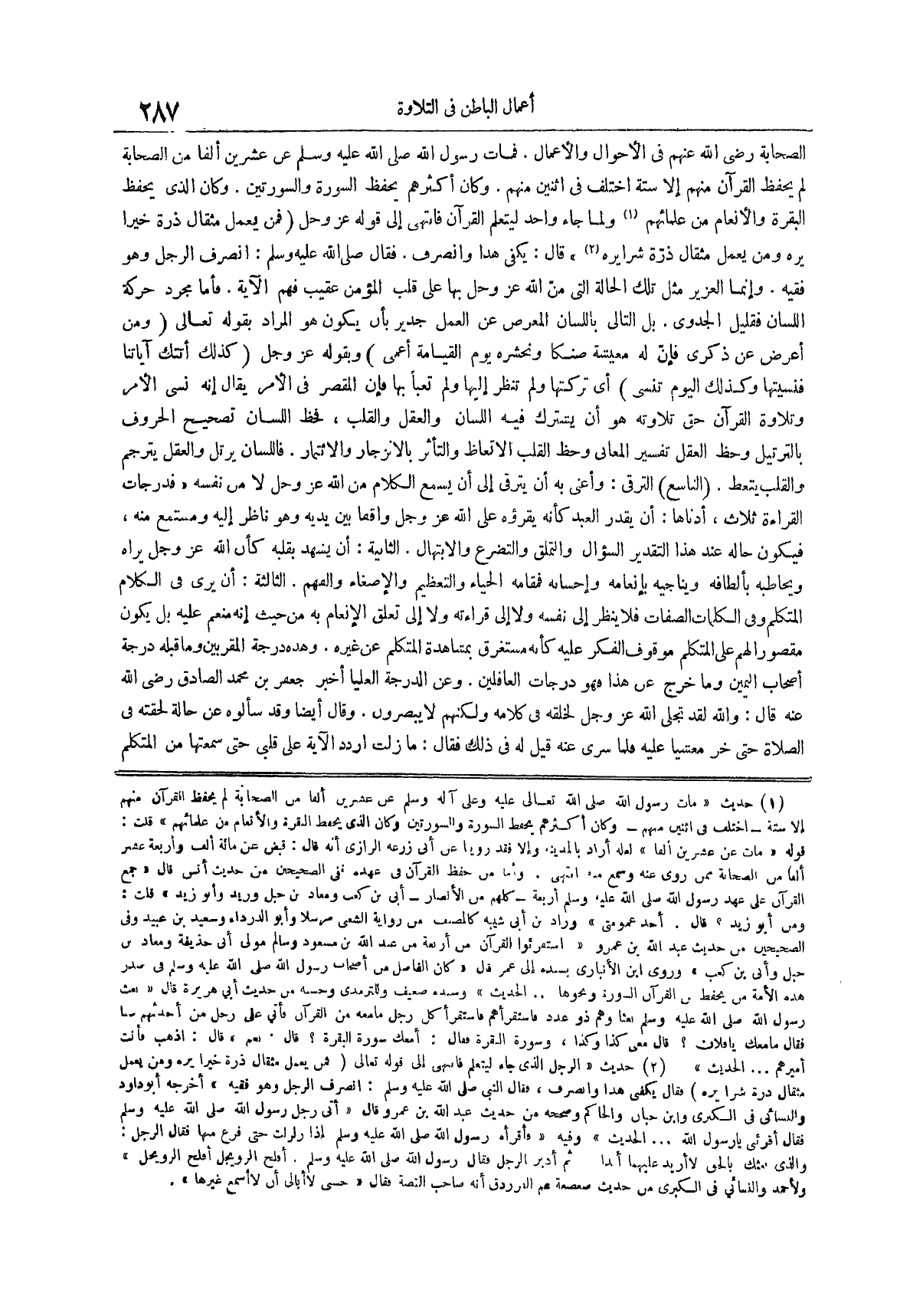 وكان أكثرهم يحفظ السورة والسورتين وكان الذي يحفظ البقرة والأنعام من علمائهم (¬1) ولما جاء واحد ليتعلم القرآن فانتهى إلى قوله عز وجل {فَمَنْ يَعْمَلْ مِثْقَالَ ذَرَّةٍ خَيْرًا يَرَهُ وَمَنْ يعمل مثقال ذرة شراً يره} (¬2) قال يكفي هذا وانصرف فقال صلى الله عليه وسلم انصرف الرجل وهو فقيه وإنما العزيز مثل تلك الحالة التي من الله عز وجل بها على قلب المؤمن عقيب فهم الآية