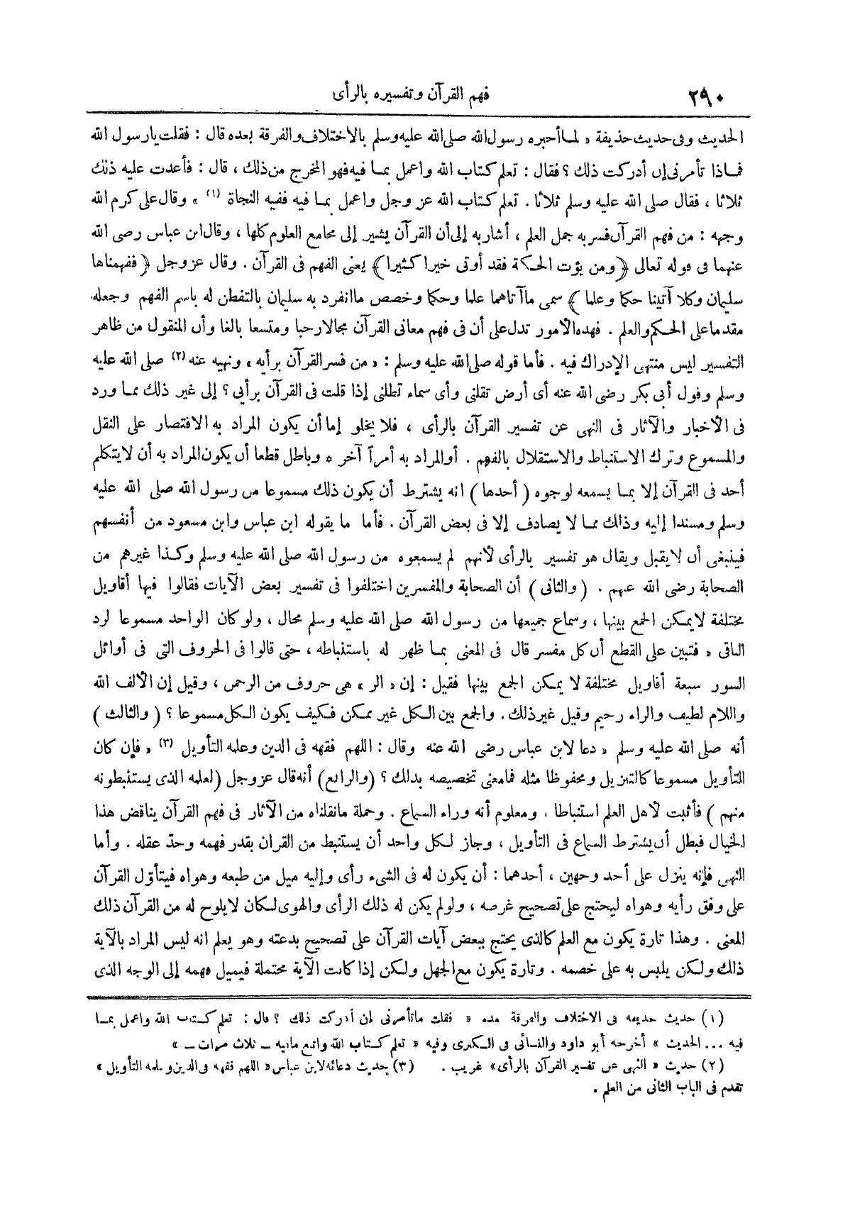 الحديث وفي حديث حذيفة لما أخبره رسول الله صلى الله عليه وسلم بالاختلاف والفرقة بعده قال فقلت يا رسول الله فماذا تأمرني إن أدركت ذلك فقال تعلم كتاب الله واعمل بما فيه فهو المخرج من ذلك قال فأعدت عليه ذلك ثلاثاً فقال صلى الله عليه وسلم ثلاثاً تعلم كتاب الله عز وجل واعمل بما فيه ففيه النجاة (¬1) وقال علي كرم الله وجهه من فهم القرآن فسر به جمل العلم أشار به إلى أن القرآن يشير إلى مجامع العلوم كلها وقال ابن عباس رضي الله عنهما في قوله تعالى ومن يؤت الحكمة فقد أوتي خيراً كثيراً يعني الفهم في القرآن وقال عز وجل ففهمناها سليمان وكلاً آتينا حكماً وعلماً سمى ما آتاهما علماً وحكما وخصص ما انفرد به سليمان بالتفطن له باسم الفهم وجعله مقدماً على الحكم والعلم فهذه الأمور تدل على أن في فهم معاني القرآن مجالاً رحباً ومتسعاً بالغاً وأن المنقول من ظاهر التفسير ليس منتهى الإدراك فيه