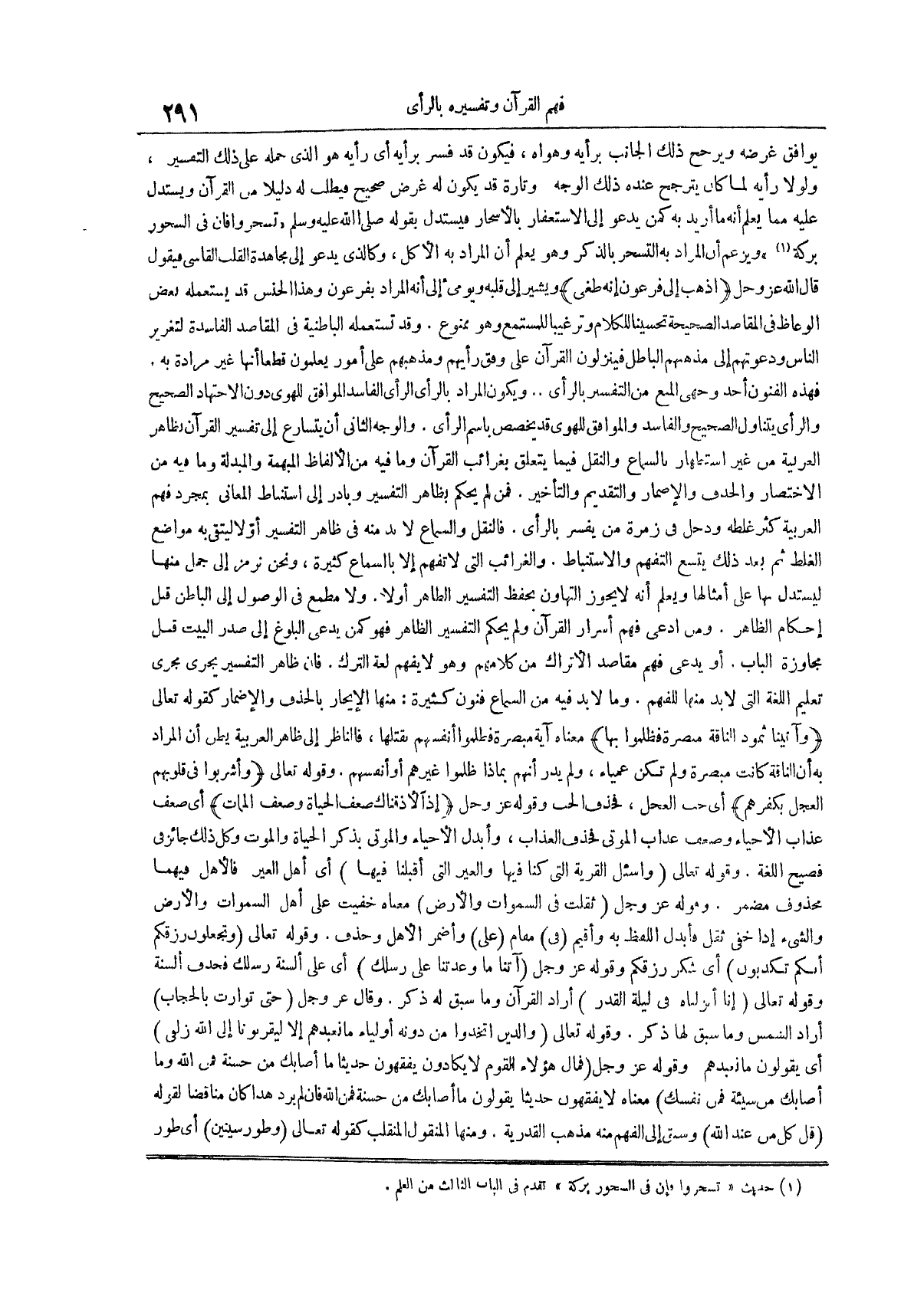 يوافق غرضه ويرجح ذلك الجانب برأيه وهواه فيكون قد فسر برأيه أي رأيه هو الذي حمله على ذلك التفسير ولولا رأيه لما كان يترجح عنده ذلك الوجه وتارة قد يكون له غرض صحيح فيطلب له دليلاً من القرآن ويستدل عليه مما يعلم أنه ما أريد به كمن يدعو إلى الاستغفار بالأسحار فيستدل بقوله صلى الله عليه وسلم تسحروا فإن في السحور بركة (¬1) ويزعم أن المراد به التسحر بالذكر وهو يعلم أن المراد به الأكل وكالذي يدعو إلى مجاهدة القلب القاسي فيقول قال الله عز وجل اذهب إلى فرعون إنه طغى ويشير إلى قلبه ويومئ إلى أنه المراد بفرعون وهذا الجنس قد يستعمله بعض الوعاظ في المقاصد الصحيحة تحسيناً للكلام وترغيباً للمستمع وهو ممنوع وقد تستعمله الباطنية في المقاصد الفاسدة لتغرير الناس ودعوتهم إلى مذهبهم الباطل فينزلون القرآن على وفق رأيهم ومذهبهم على أمور يعلمون قطعاً أنها غير مرادة به فهذه الفنون أحد وجهي المنع من التفسير بالرأي ويكون المراد بالرأي الرأي الفاسد الموافق للهوى دون الاجتهاد الصحيح والرأي يتناول الصحيح والفاسد والموافق للهوى قد يخصص باسم الرأي