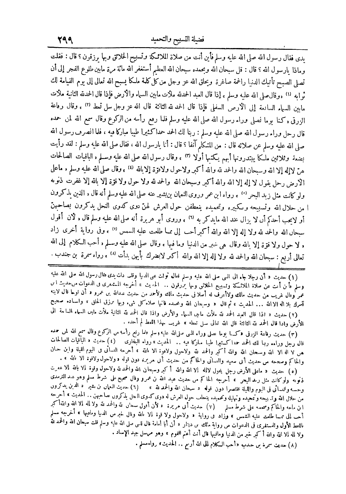 يدي فَقَالَ رَسُولُ اللَّهِ صَلَّى اللَّهُ عَلَيْهِ وَسَلَّمَ فأين أنت من صلاة الملائكة وتسبيح الخلائق وبها يرزقون قال فقلت وماذا يا رسول الله قال قل سبحان الله وبحمده سبحان الله العظيم استغفر الله مائة مرة ما بين طلوع الفجر إلى أن تصلي الصبح تأتيك الدنيا راغمة صاغرة ويخلق الله عز وجل من كل كلمة ملكاً يسبح الله تعالى إلى يوم القيامة لك ثوابه (¬1) وقال صلى الله عليه وسلم إذا قال العبد الحمد لله ملأت ما بين السماء والأرض فإذا قال الحمد لله الثانية ملأت ما بين السماء السابعة إلى الأرض السفلى فإذا قال الحمد لله الثالثة قال الله عز وجل سل تعط (¬2) وقال رفاعة الزرقي كنا يوماً نصلي وراء رسول الله صلى الله عليه وسلم فلما رفع رأسه من الركوع وقال سمع الله لمن حمده قال رجل وراء رسول الله صلى الله عليه وسلم ربنا لك الحمد حمداً كثيراً طيباً مباركاً فيه فلما انصرف رسول الله صلى الله عليه وسلم عن صلاته قال من المتكلم آنفاً قال أنا يا رسول الله فقال صلى الله عليه وسلم لقد رأيت بضعة وثلاثين ملكاً يبتدرونها أيهم يكتبها أولاً (¬3) وَقَالَ رَسُولُ اللَّهِ صَلَّى اللَّهُ عَلَيْهِ وَسَلَّمَ الباقيات الصالحات هن لا إله إلا الله وسبحان الله والحمد لله والله أكبر ولا حول ولا قوة إلا بالله (¬4) وقال صلى الله عليه وسلم ما على الأرض رجل يقول لا إله إلا الله والله أكبر وسبحان الله والحمد لله ولا حول ولا قوة إلا بالله إلا غفرت ذنوبه ولو كانت مثل زبد البحر (¬5) رواه ابن عمر وروى النعمان بن بشير عنه صلى الله عليه وسلم أنه قال الذين يذكرون من جلال الله وتسبيحه وتكبيره وتحميده ينعطفن حول العرش لهن دوي كدوي النحل يذكرون بصاحبهن أو لا يحب أحدكم أن لا يزال عند الله ما يذكر به (¬6) وَرَوَى أَبُو هُرَيْرَةَ أَنَّهُ صَلَّى اللَّهُ عَلَيْهِ وسلم قال لأن أقول سُبْحَانَ اللَّهِ وَالْحَمْدُ لِلَّهِ وَلَا إِلَهَ إِلَّا الله والله أكبر أحب إلي مما طلعت عليه الشمس (¬7) وفي رواية أخرى زاد لا حول ولا قوة إلا بالله وقال هي خير مِنَ الدُّنْيَا وَمَا فِيهَا وَقَالَ صَلَّى اللَّهُ عَلَيْهِ وَسَلَّمَ أَحَبُّ الْكَلَامِ إِلَى اللَّهِ تَعَالَى أَرْبَعٌ سُبْحَانَ اللَّهِ وَالْحَمْدُ لِلَّهِ وَلَا إِلَهَ إِلَّا اللَّهُ وَاللَّهُ أَكْبَرُ لَا يَضُرُّكَ بِأَيِّهِنَّ بدأت (¬8) رواه سمرة بن جندب