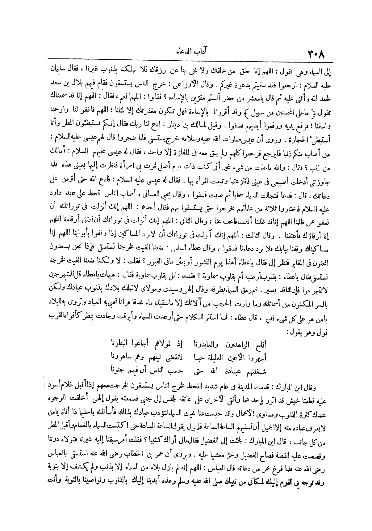 وقيل لمالك بن دينار ادع لنا ربك فقال إنكم تستبطئون المطر وأنا أستبطىء الحجارة وروي أن عيسى صلوات الله عليه وسلامه خرج يستسقي فلما ضجروا قال لهم عيسى عليه السلام من أصاب منكم ذنباً فليرجع فرجعوا كلهم ولم يبق معه في المفازة إلا واحد فقال له عيسى عليهم السلام أما لك من ذنب فقال والله ما علمت من شيء غير أني كنت ذات يوم أصلي فمرت بي امرأة فنظرت إليها بعيني هذه فلما جاوزتني أدخلت أصبعي في عيني فانتزعتها وتبعت المرأة بها فقال له عيسى عليه السلام فادع الله حتى أؤمن على دعائك قال فدعا فتجللت السماء سحاباً ثم صبت فسقوا وقال يحيى الغساني أصاب الناس قحط على عهد داود عليه السلام فاختاروا ثلاثة من علمائهم فخرجوا حتى يستسقوا بهم فقال أحدهم اللهم إنك أنزلت في توراتك أن نعفو عمن ظلمنا اللهم إنا قد ظلمنا أنفسنا فاعف عنا وقال الثاني اللهم إنك أنزلت في توراتك أن نعتق أرقاءنا اللهم إنا أرقاؤك فأعتقنا وقال الثالث اللهم إنك أنزلت في توراتك أن لا نرد المساكين إذا وقفوا بأبوابنا اللهم إنا مساكينك وقفنا ببابك فلا ترد دعاءنا فسقوا وقال عطاء السلمي منعنا الغيث فخرجنا نستسقي فإذا نحن بسعدون المجنون في المقابر فنظر إلي فقال يا عطاء أهذا يوم النشور أوبعثر ما في القبور فقلت لا ولكنا منعنا الغيث فخرجنا نستسقي فقال يا عطاء بقلوب أرضية أم بقلوب سماوية فقلت بل بقلوب سماوية فقال هيهات يا عطاء قل للمتبهرجين لا تتبهرجوا فإن الناقد بصير ثم رمق السماء بطرفه وقال إلهي وسيدي ومولاي لا تهلك بلادك بذنوب عبادك ولكن بالسر المكنون من أسمائك وما وارت الحجب من آلائك إلا ما سقيتنا ماء غدقاً فراتاً تحيي به العباد وتروي به البلاد يا من هو على كل شيء قدير قال عطاء فما استتم الكلام حتى أرعدت السماء وأبرقت وجادت بمطر كأفواه القرب فولى وهو يقول