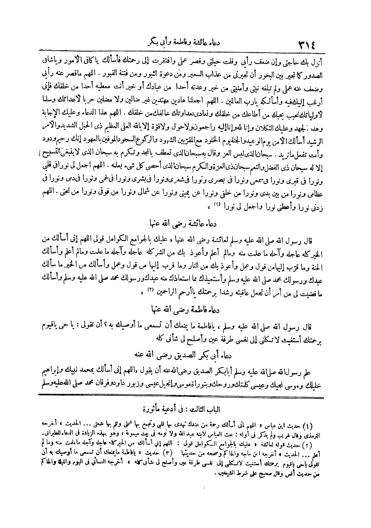 (¬3) حديث يا فاطمة ما يمنعك أن تسمعي ما أوصيك به أن تقولي يا حي يا قيوم برحمتك أستغيث لا تكلني إلى نفسي طرفة عين وأصلح لي شأني كله أخرجه النسائي في اليوم والليلة والحاكم من حديث أنس وقال صحيح على شرط الشيخين