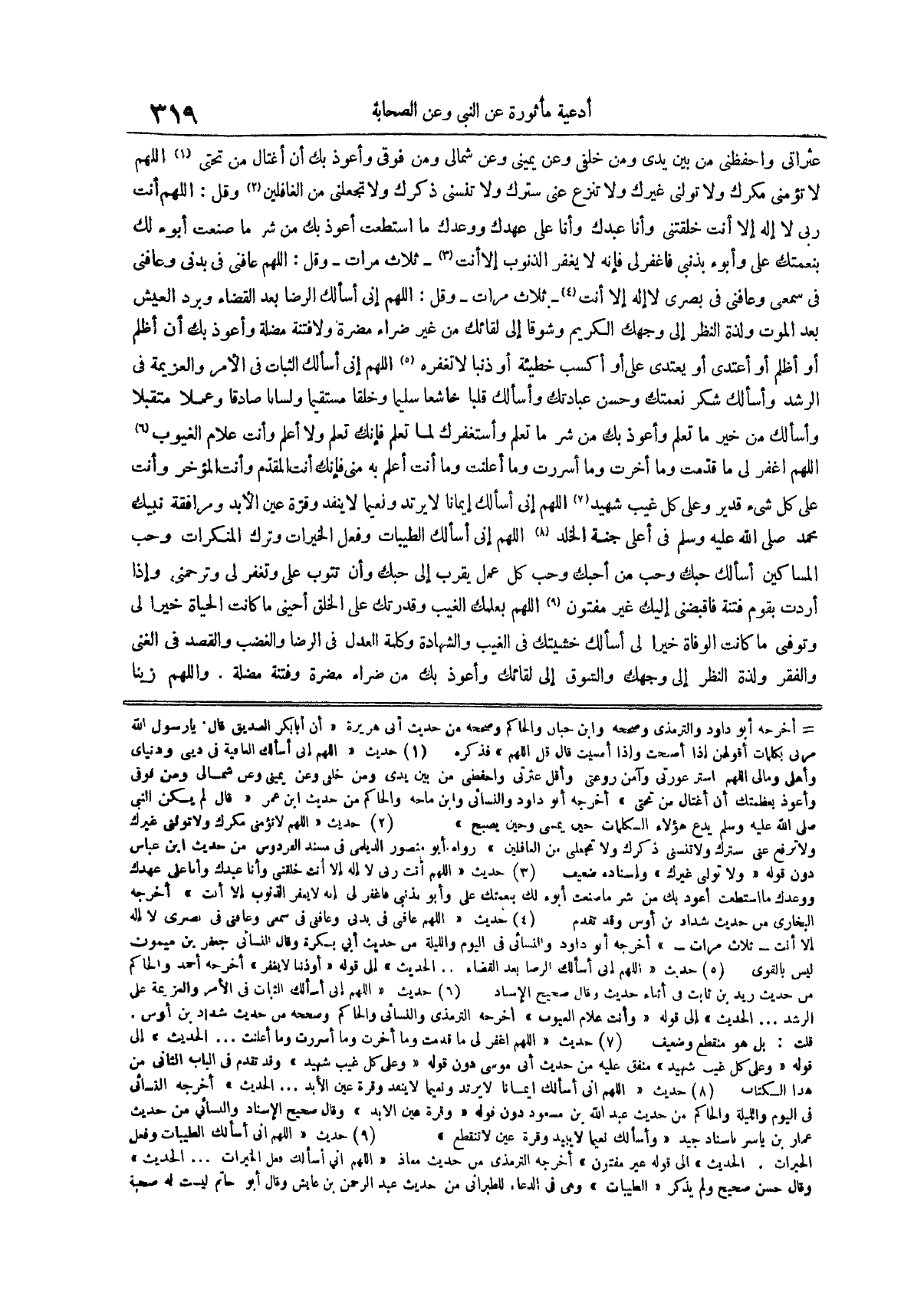 عثراتي واحفظني من بين يدي ومن خلفي وعن يميني وعن شمالي ومن فوقي وأعوذ بك أن أغتال من تحتي (¬1) اللهم لا تؤمني مكرك ولا تولني غيرك ولا تنزع عني سترك ولا تنسني ذكرك ولا تجعلني من الغافلين (¬2) وقل اللهم أنت ربي لا إله إلا أنت خلقتني وأنا عبدك وأنا على عهدك ووعدك ما استطعت أعوذ بك من شر ما صنعت أبوء لك بنعمتك علي وأبوء بذنبي فاغفر لي فإنه لا يغفر الذنوب إلا أنت (¬3) ثلاث مرات وقل اللهم عافني في بدني وعافني في سمعي وعافني في بصري لا إله إلا أنت (¬4) ثلاث مرات وقل اللهم إني أسألك الرضا بعد القضاء وبرد العيش بعد الموت ولذة النظر إلى وجهك الكريم وشوقاً إلى لقائك من غير ضراء مضرة ولا فتنة مضلة وأعوذ بك أن أظلم أو أظلم أو أعتدي أو يعتدى علي أو أكسب خطيئة أو ذنباً لا تغفره (¬5) اللهم إني أسألك الثبات في الأمر والعزيمة في الرشد وأسألك شكر نعمتك وحسن عبادتك وأسألك قلباً خاشعاً سليماً وخلقاً مستقيماً ولساناً صادقاً وعملاً متقبلاً وأسألك من خير ما تعلم وأعوذ بك من شر ما تعلم وأستغفرك لما تعلم فإنك تعلم ولا أعلم وأنت علام الغيوب (¬6) اللَّهُمَّ اغْفِرْ لِي مَا قَدَّمْتُ وَمَا أَخَّرْتُ وَمَا أَسْرَرْتُ وَمَا أَعْلَنْتُ وَمَا أَنْتَ أَعْلَمُ به مني فإنك أَنْتَ الْمُقَدِّمُ وَأَنْتَ الْمُؤَخِّرُ وَأَنْتَ عَلَى كُلِّ شيء قدير وعلى كل غيب شهيد (¬7) اللهم إني أسألك إيماناً لا يرتد ونعيماً لا ينفد وقرة عين الأبد ومرافقة نبيك محمد صلى الله عليه وسلم في أعلى جنة الخلد (¬8) اللهم إني أسألك الطيبات وفعل الخيرات وترك المنكرات وحب المساكين أسألك حبك وحب من أحبك وحب كل عمل يقرب إلي حبك وأن تتوب علي وتغفر لي وترحمني وإذا أردت بقوم فتنة فاقبضني إليك غير مفتون (¬9) اللهم بعلمك الغيب وقدرتك على الخلق أحيني ما كانت الحياة خيراً لي وتوفني ما كانت الوفاة خيراً لي أسألك خشيتك في الغيب والشهادة وكلمة العدل في الرضا والغضب والقصد في الغنى والفقر ولذة النظر إلى وجهك والشوق إلى لقائك وأعوذ بك من ضراء مضرة وفتنة مضلة واللهم زينا