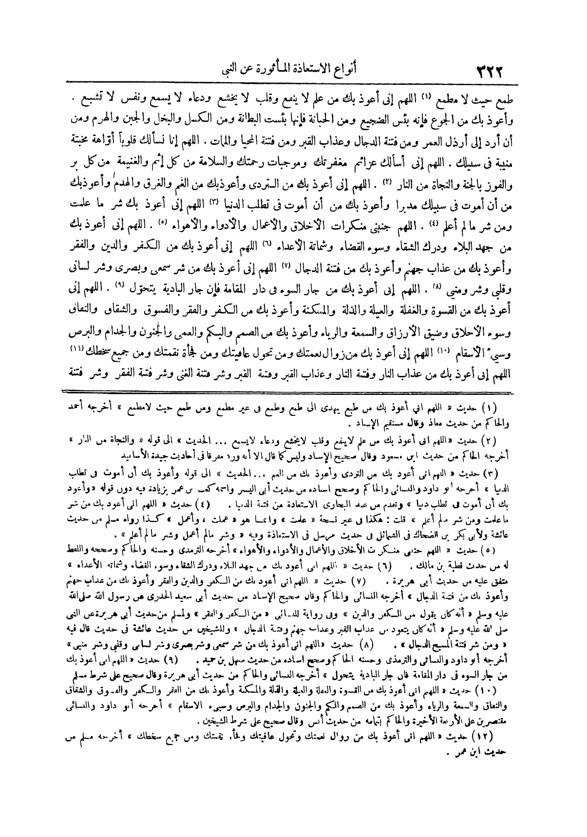 طمع حيث لا مطمع (¬1) اللهم إني أعوذ بك من علم لا ينفع وقلب لا يخشع ودعاء لا يسمع ونفس لا تشبع وأعوذ بك من الجوع فإنه بئس الضجيع ومن الخيانة فإنها بئست البطانة ومن الكسل والبخل والجبن والهرم ومن أن أرد إلى ارذل العمر ومن فتنة الدجال وعذاب القبر ومن فتنة المحيا والممات اللهم إنا نسألك قلوباً أواهة مخبتة منيبة في سبيلك اللهم إني أسألك عزائم مغفرتك وموجبات رحمتك والسلامة من كل إثم والغنيمة من كل بر والفوز بالجنة والنجاة من النار (¬2) اللهم إني أعوذ بك من التردي وأعوذ بك من الغم والغرق والهدم وأعوذ بك من أن أموت في سبيلك مدبراً وأعوذ بك من أن أموت في تطلب الدنيا (¬3) اللهم إني أعوذ بك شر ما علمت ومن شر ما لم أعلم (¬4) اللهم جنبني منكرات الأخلاق والأعمال والأدواء والأهواء (¬5) اللهم إني أعوذ بك من جهد البلاء ودرك الشقاء وسوء القضاء وشماتة الأعداء (¬6) اللهم إني أعوذ بك من الكفر والدين والفقر وأعوذ بك من عذاب جهنم وأعوذ بك من فتنة الدجال (¬7) اللهم إني أعوذ بك من شر سمعي وبصري وشر لساني وقلبي وشر منيي (¬8) اللهم إني أعوذ بك من جار السوء في دار المقامة فإن جار البادية يتحول (¬9) اللهم إني أعوذ بك من القسوة والغفلة والعيلة والذلة والمسكنة وأعوذ بك من الكفر والفقر والفسوق والشقاق والنفاق وسوء الأخلاق وضيق الأرزاق والسمعة والرياء وأعوذ بك من الصمم والبكم والعمى والجنون والجذام والبرص وسيىء الأسقام (¬10) اللهم إني أعوذ بك من زوال نعمتك ومن تحول عافيتك ومن فجأة نقمتك ومن جميع سخطك (¬11) اللهم إني أعوذ بك من عذاب النار وفتنة النار وعذاب القبر وشر فتنة الغنى وشر فتنة الفقر وشر فتنة