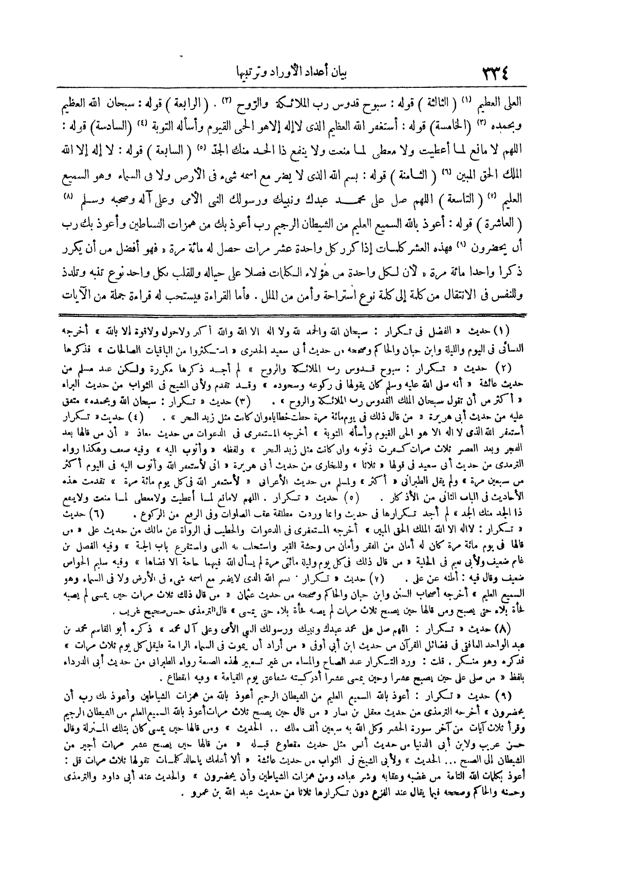 العلي العظيم (¬1) الثالثة قوله سبوح قدوس رب الملائكة والروح (¬2) الرابعة قوله سبحان الله العظيم وبحمده (¬3) الخامسة قوله أستغفر الله العظيم الذي لا إله إلا هو الحي القيوم وأسأله التوبة (¬4) السادسة قوله اللهم لا مانع لما أعطيت ولا معطي لما منعت ولا ينفع ذا الجد منك الجد (¬5) السابعة قوله لا إله إلا الله الملك الحق المبين (¬6) الثامنة قوله بسم الله الذي لا يضر مع اسمه شيء في الأرض ولا في السماء وهو السميع العليم (¬7) التاسعة اللهم صل على محمد عبدك ونبيك ورسولك النبي الأمي وعلى آله وصحبه وسلم (¬8) العاشرة قوله أَعُوذُ بِاللَّهِ السَّمِيعِ الْعَلِيمِ مِنَ الشَّيْطَانِ الرَّجِيمِ رب أعوذ بك من همزات الشياطين وأعوذ بك رب أن يحضرون (¬9) فهذه العشر كلمات إذا كرر كل واحدة عشر مرات حصل له مائة مرة فهو أفضل من أن يكرر ذكراً واحداً مائة مرة لأن لكل واحدة من هؤلاء الكلمات فضلاً على حياله وللقلب بكل واحد نوع تنبه وتلذذ وللنفس في الانتقال من كلمة إلى كلمة نوع استراحة وأمن من الملل