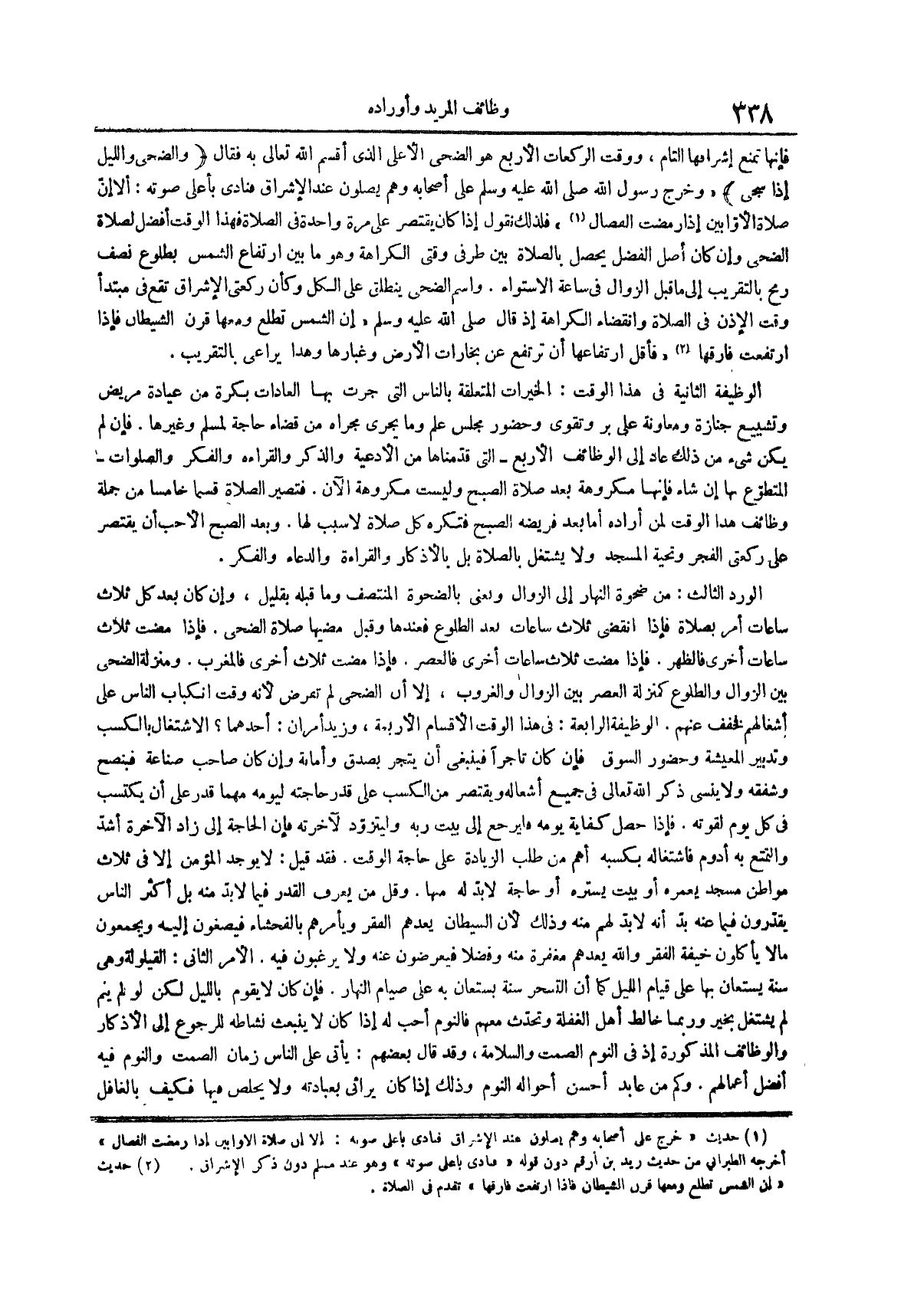 الوظيفة الثانية في هذا الوقت الخيرات المتعلقة بالناس التي جرت بها العادات بكرة من عيادة مريض وتشييع جنازة ومعاونة على بر وتقوى وحضور مجلس علم وما يجري مجراه من قضاء حاجة لمسلم وغيرها فإن لم يكن شيء من ذلك عاد إلى الوظائف الأربع التي قدمناها من الأدعية والذكر والقراءة والفكر والصلوات المتطوع بها إن شاء فإنها مكروهة بعد صلاة الصبح وليست مكروهة الآن فتصير الصلاة قسماً خامساً من جملة وظائف هذا الوقت لمن أراده أما بعد فريضة الصبح فتكره كل صلاة لا سبب لها وبعد الصبح الأحب أن يقتصر على ركعتي الفجر وتحية المسجد ولا يشتغل بالصلاة بل بالأذكار والقراءة والدعاء والفكر