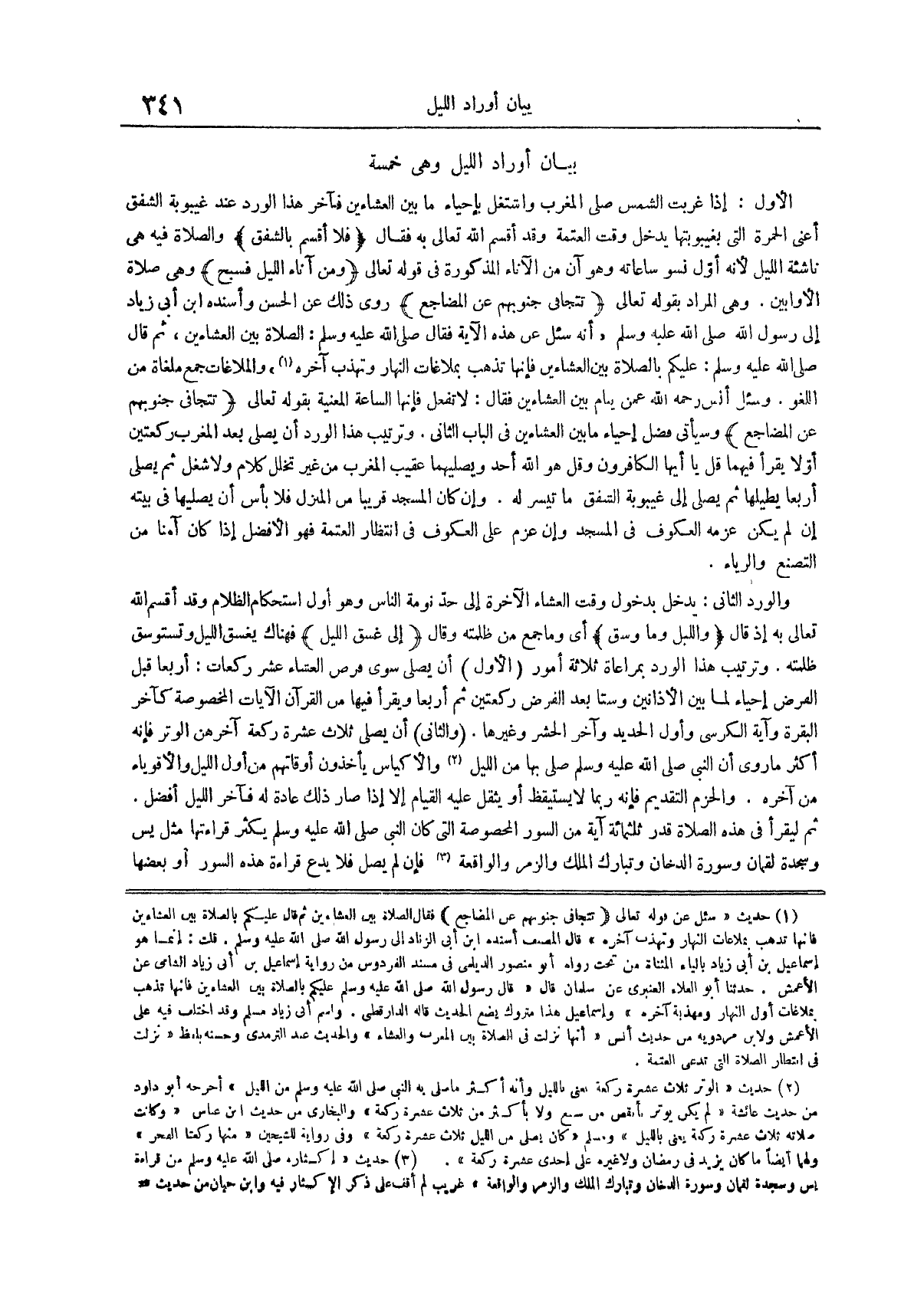 الأول إذا غربت الشمس صلى المغرب واشتغل بإحياء ما بين العشاءين فآخر هذا الورد عند غيبوبة الشفق أعني الحمرة التي بغيبوبتها يدخل وقت العتمة وقد أقسم الله تعالى به فقال {فلا أقسم بالشفق} والصلاة فيه هي ناشئة الليل لأنه أول نشوء ساعاته وهو آن من الآناء المذكورة في قوله تعالى {ومن آناء الليل فسبح} وهي صلاة الأوابين وهي المراد بقوله تعالى {تتجافى جنوبهم عن المضاجع} روي ذلك عن الحسن وأسنده ابن أبي زياد إِلَى رَسُولِ اللَّهِ صَلَّى اللَّهُ عَلَيْهِ وَسَلَّمَ أنه سئل عن هذه الآية فقال صلى الله عليه وسلم الصلاة بين العشاءين ثم قال صلى الله عليه وسلم عليكم بالصلاة بين العشاءين فإنها تذهب بملاغات النهار وتهذب آخره (¬1) والملاغات جمع ملغاة من اللغو وسئل أنس رحمه الله عمن ينام بين العشاءين فقال لا تفعل فإنها الساعة المعنية بقوله تعالى {تتجافى جنوبهم عن المضاجع} وسيأتي فضل إحياء ما بين العشاءين في الباب الثاني وترتيب هذا الورد أن يصلي بعد المغرب ركعتين أولاً يقرأ فيهما قل يا أيها الكافرون وقل هو الله أحد ويصليهما عقيب المغرب من غير تخلل كلام ولا شغل ثم يصلي أربعاً يطيلها ثم يصلي إلى غيبوبة الشفق ما تيسر له وإن كان المسجد قريباً من المنزل فلا بأس أن يصليها في بيته إن لم يكن عزمه العكوف في المسجد وإن عزم على العكوف في انتظار العتمة فهو الأفضل إذا كان آمناً من التصنع والرياء