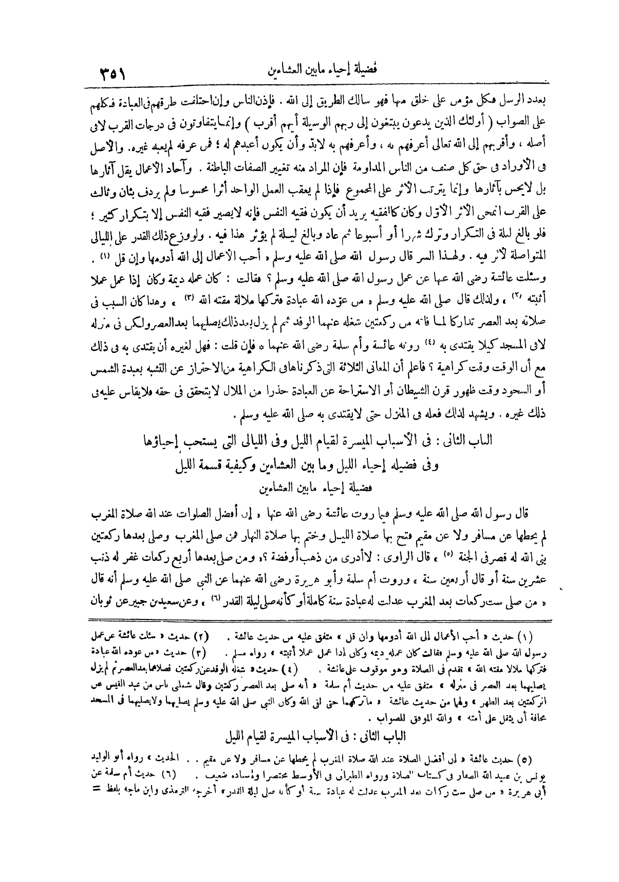 الباب الثاني في الأسباب الميسرة لقيام الليل وفي الليالي التي يستحب إحياؤها وفي فضيلة إحياء الليل وما بين العشاءين وكيفية قسمة الليل