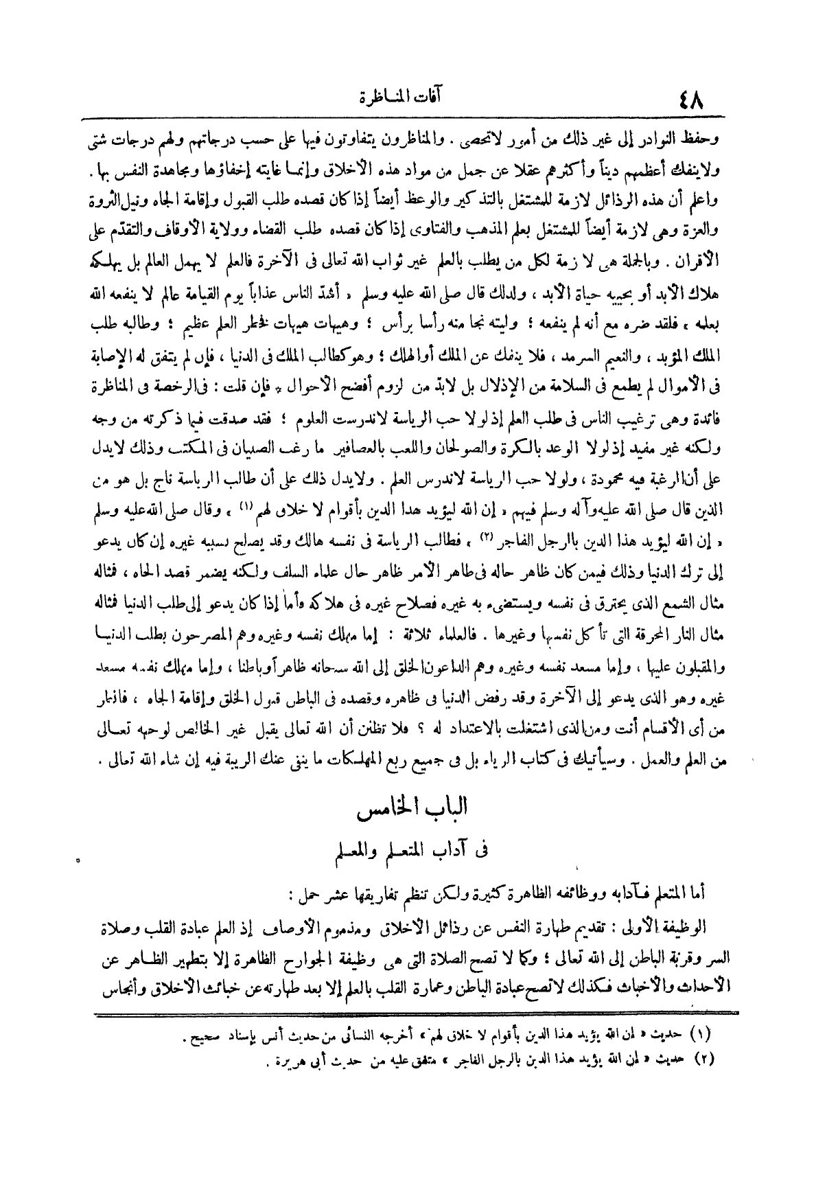 الباب الخامس في آداب المتعلم والمعلم أما المتعلم فآدابه ووظائفه
