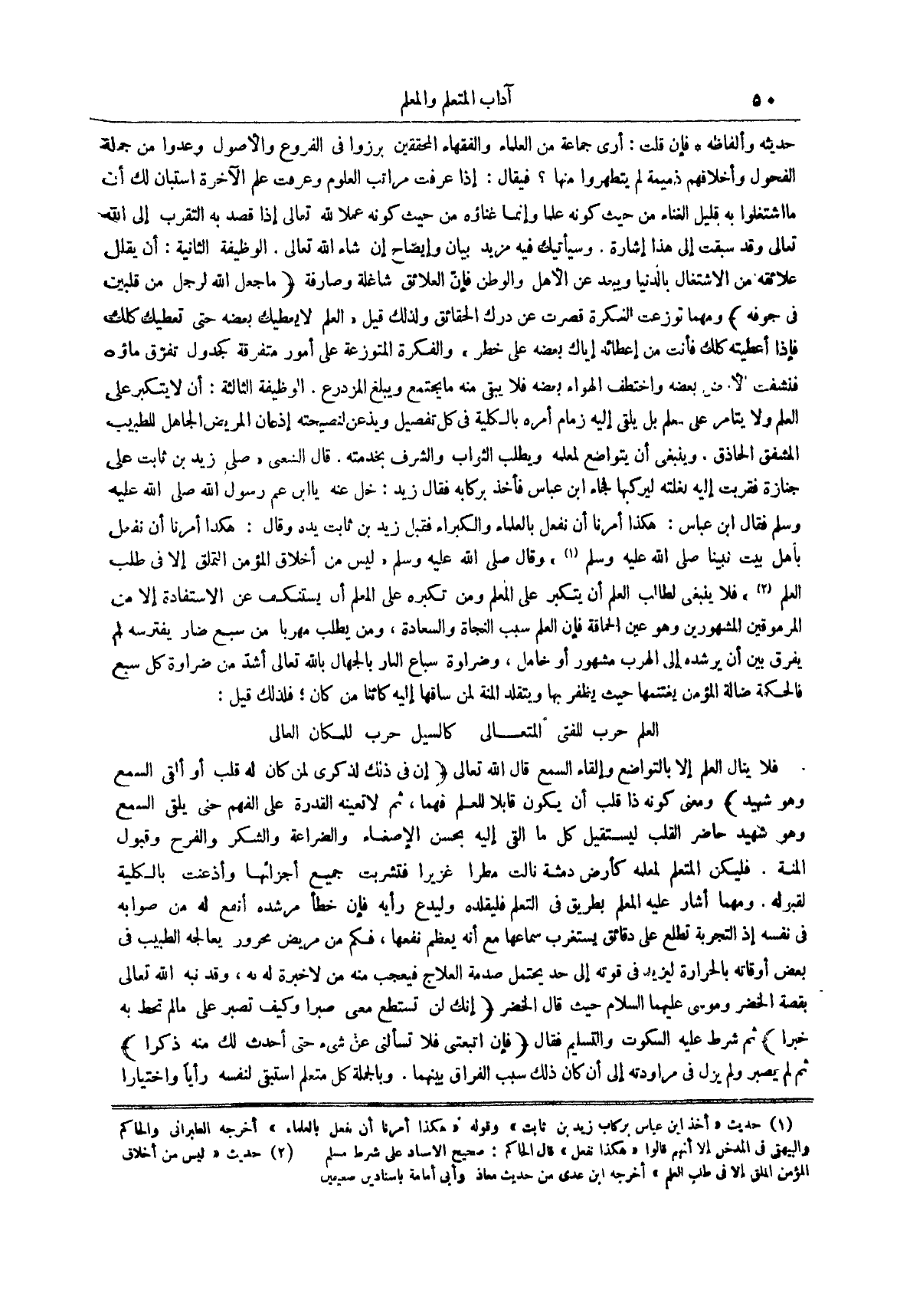 حديثه وألفاظه فإن قلت أرى جماعة من العلماء والفقهاء المحققين برزوا في الفروع والأصول وعدوا من جملة الفحول وأخلاقهم ذميمة لم يتطهروا منها فيقال إذا عرفت مراتب العلوم وعرفت علم الآخرة استبان لك أن ما اشتغلوا به قليل الغناء من حيث كونه علماً وإنما غناؤه من حيث كونه عملاً لله تعالى إذا قصد به التقرب إلى الله تعالى وقد سبقت إلى هذا إشارة