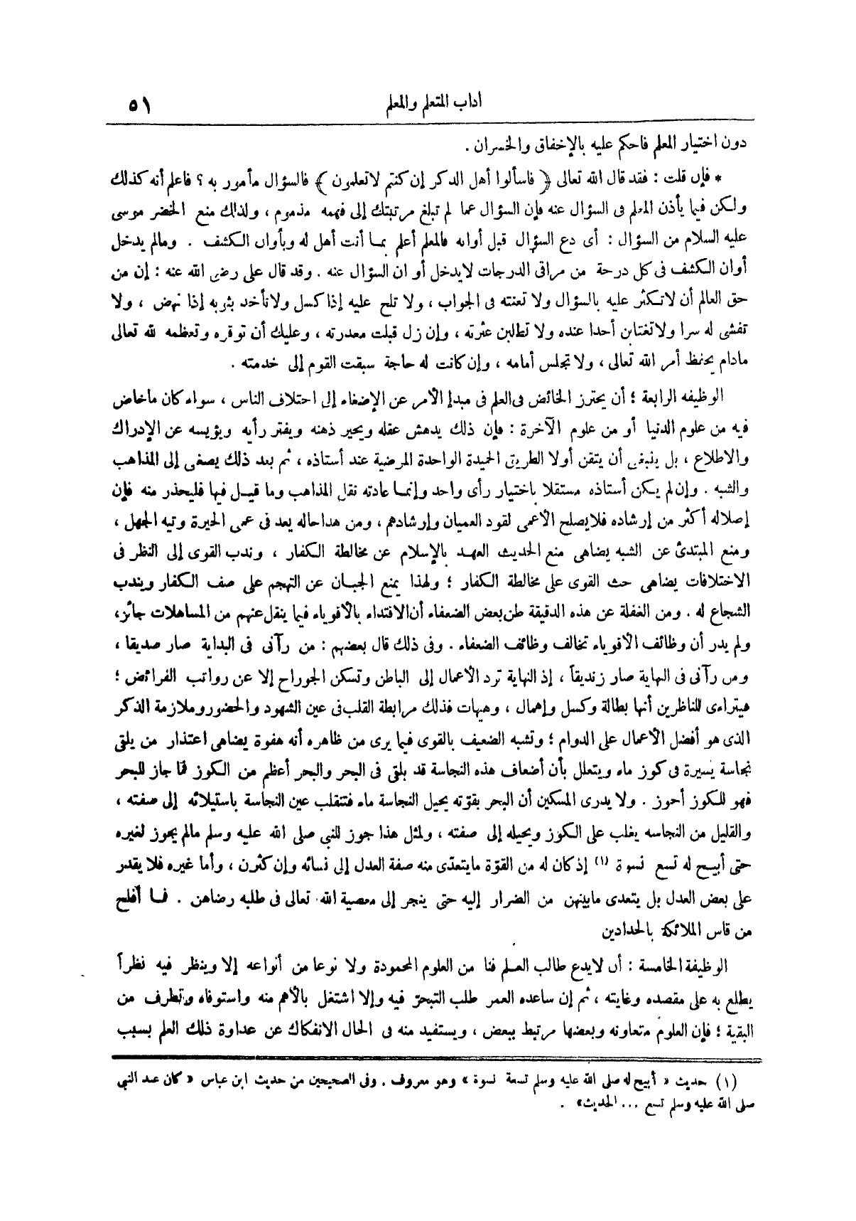 الوظيفة الخامسة أن لا يدع طالب العلم فناً من العلوم المحمودة ولا نوعاً من أنواعه إلا وينظر فيه نظراً يطلع به على مقصده وغايته ثم إن ساعده العمر طلب التبحر فيه وإلا اشتغل بالأهم منه واستوفاه وتطرف من البقية فإن العلوم متعاونة وبعضها مرتبط ببعض ويستفيد منه في الحال الانفكاك عن عداوة ذلك العلم بسبب