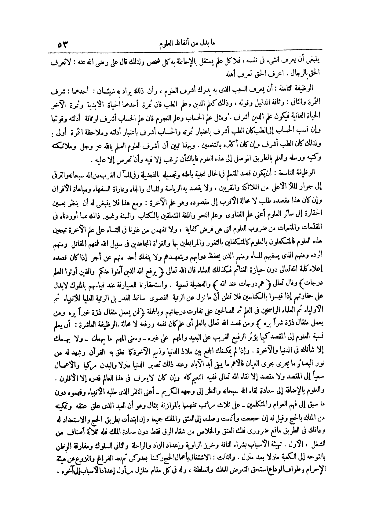 الوظيفة التاسعة أن يكون قصد المتعلم في الحال تحلية باطنه وتجميله بالفضيلة وفي المآل القرب من الله سبحانه والترقي إلى جوار الملأ الأعلى من الملائكة والمقربين ولا يقصد به الرياسة والمال والجاه ومماراة السفهاء ومباهاة الأقران وإن كان هذا مقصده طلب لا محالة الأقرب إلى مقصوده وهو علم الآخرة ومع هذا فلا ينبغي له أن ينظر بعين الحقارة إلى سائر العلوم أعني علم الفتاوى وعلم النحو واللغة المتعلقين بالكتاب والسنة وغير ذلك مما أوردناه في المقدمات والمتممات من ضروب العلوم التي هي فرض كفاية ولا تفهمن من غلونا في الثناء على علم الآخرة تهجين هذه العلوم فالمتكفلون بالعلوم كالمتكفلين بالثغور والمرابطين بها والغزاة المجاهدين في سبيل الله فمنهم المقاتل ومنهم الردء ومنهم الذي يسقيهم الماء ومنهم الذي يحفظ دوابهم ويتعهدهم ولا ينفك أحد منهم عن أجر إذا كان قصده إعلاء كلمة الله تعالى دون حيازة الغنائم فكذلك العلماء قال اللَّهُ تَعَالَى {يَرْفَعِ اللَّهُ الَّذِينَ آمَنُوا مِنْكُمْ والذين أوتوا العلم درجات} وقال تعالى {هم درجات عند الله} والفضيلة نسبية
