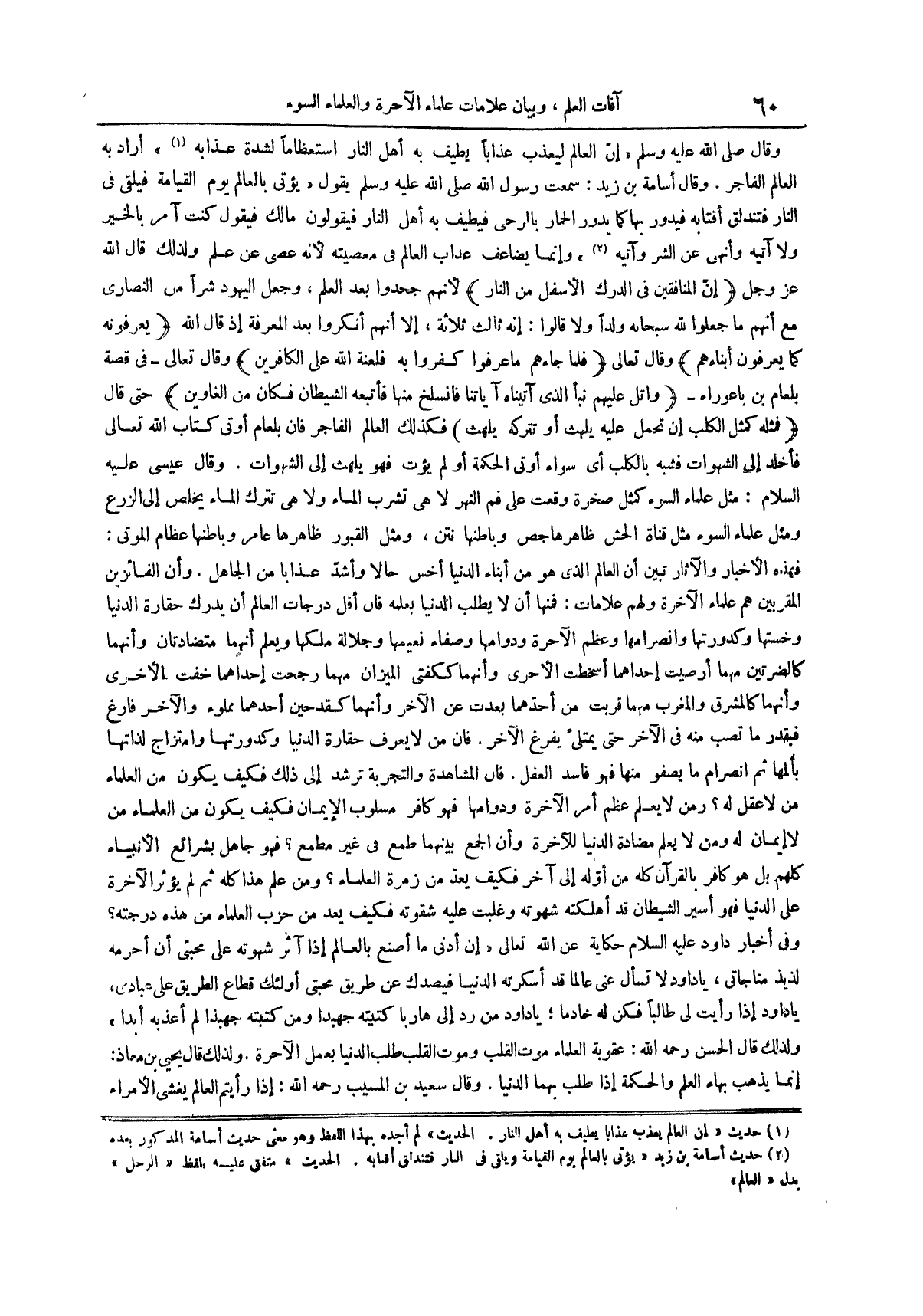 وقال أسامة بن زيد سَمِعْتُ رَسُولَ اللَّهِ صَلَّى اللَّهُ عَلَيْهِ وَسَلَّمَ يقول يؤتى بالعالم يوم القيامة فيلقى في النار فتندلق أقتابه فيدور بها كما يدور الحمار بالرحى فيطيف به أهل النار فيقولون ما لك فيقول كنت آمر بالخير ولا آتيه وأنهى عن الشر وآتيه (¬2) وإنما يضاعف عذاب العالم في معصيته لأنه عصى من علم ولذلك قال الله عز وجل إن المنافقين في الدرك الأسفل من النار لأنهم جحدوا بعد العلم وجعل اليهود شراً من النصارى مع أنهم ما جعلوا لله سبحانه ولداً ولا قالوا إنه ثالث ثلاثة إلا أنهم أنكروا بعد المعرفة إذ قال الله يعرفونه كما يعرفون أبناءهم وقال تعالى فلما جاءهم ما عرفوا كفروا به فلعنة الله على الكافرين وقال تعالى في قصة بلعام بن باعوراء واتل عليهم نبأ الذي آتيناه آياتنا فانسلخ منها فأتبعه الشيطان فكان من الغاوين حتى قال فمثله كمثل الكلب إن تحمل عليه يلهث أو تتركه يلهث فكذلك العالم الفاجر فإن بلعام أوتي كتاب الله تعالى فأخلد إلى الشهوات فشبه بالكلب أي سواء أوتي الحكمة أو لم يؤت فهو يلهث إلى الشهوات