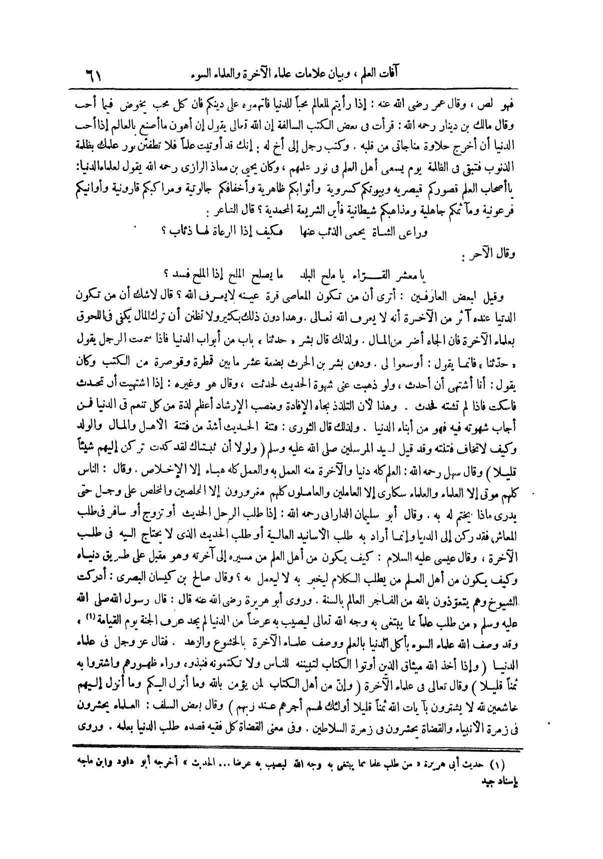 وروى أبو هريرة رضي الله عنه قال قَالَ رَسُولُ اللَّهِ صَلَّى اللَّهُ عَلَيْهِ وَسَلَّمَ من طلب علماً مما يبتغي به وجه الله تعالى ليصيب به عرضاً من الدنيا لم يجد عرف الجنة يوم القيامة (¬1) وقد وصف الله علماء السوء بأكل الدنيا بالعلم ووصف علماء الآخرة بالخشوع والزهد فقال عز وجل في علماء الدنيا وَإِذْ أَخَذَ اللَّهُ مِيثَاقَ الَّذِينَ أُوتُوا الْكِتَابَ لتبيننه للناس ولا تكتمونه فنبذوه وراء ظهورهم واشتروا به ثمناً قليلاً وقال تعالى في علماء الآخرة وإن من أهل الكتاب لمن يؤمن بالله وما أنزل إليكم وما أنزل إليهم خاشعين لله لا يشترون بآيات الله ثمناً قليلاً أولئك لهم أجرهم عند ربهم وقال بعض السلف العلماء يحشرون في زمرة الأنبياء والقضاة يحشرون في زمرة السلاطين
