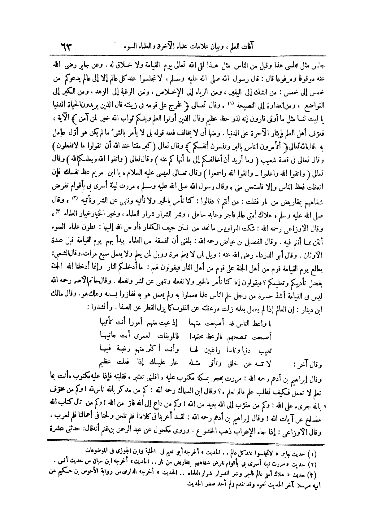 وقال إبراهيم بن أدهم رحمه الله مررت بحجر بمكة مكتوب عليه اقلبني تعتبر فقلبته فإذا عليه مكتوب أنت بما تعلم لا تعمل فكيف تطلب علم ما لم تعلم وقال ابن السماك رحمه الله كم من مذكر بالله ناس لله وكم من مخوف بالله جريء على الله وكم من مقرب إلى الله بعيد من الله وكم من داع إلى الله فار من الله وكم من تال كتاب الله منسلخ عن آيات الله وقال إبراهيم بن أدهم رحمه الله لقد أعربنا في كلامنا فلم نلحن ولحنا في أعمالنا فلم نعرب
