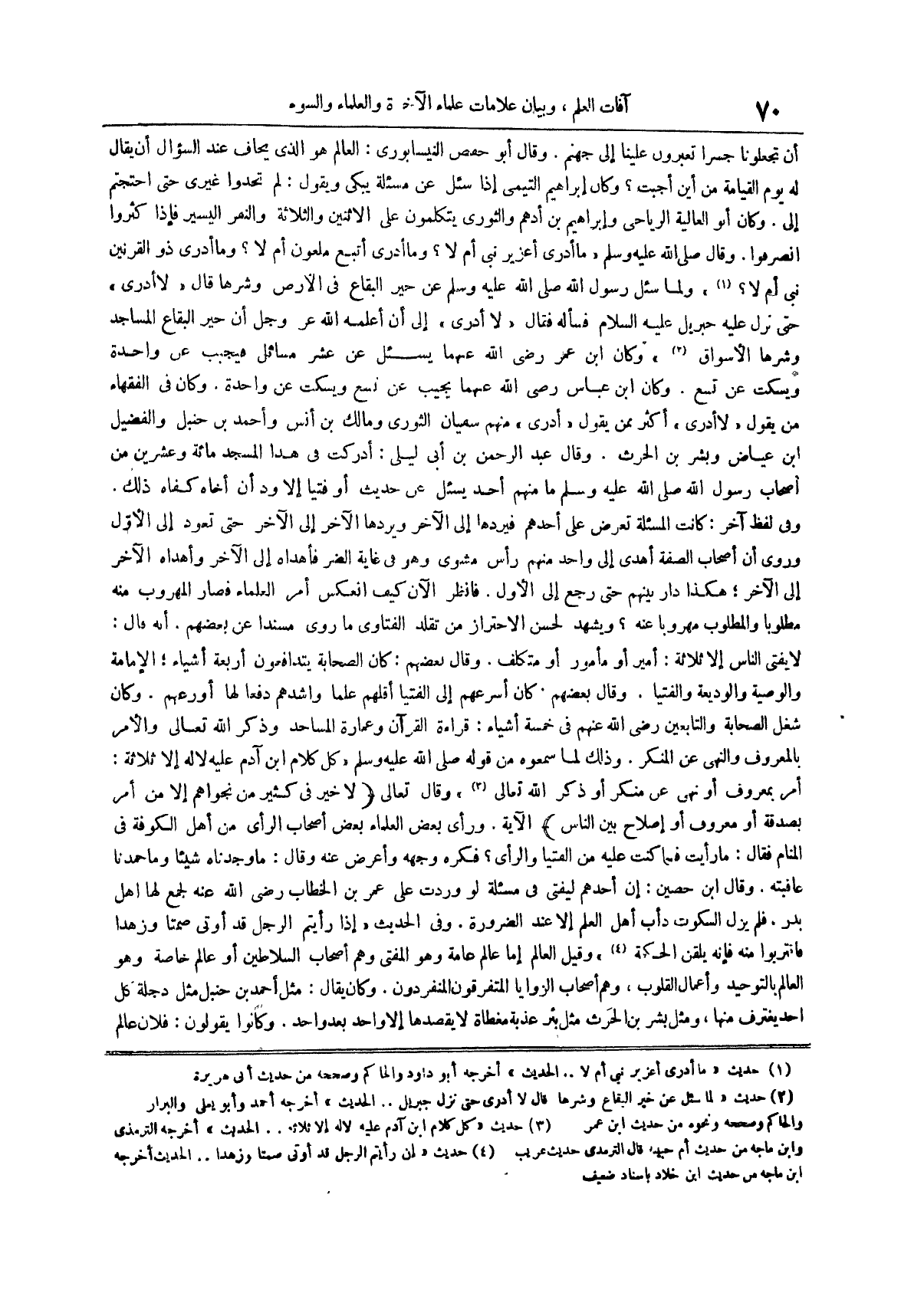 وقال أبو حفص النيسابوري العالم هو الذي يخاف عند السؤال أن يقال له يوم القيامة من أين أجبت وكان إبراهيم التيمي إذا سئل عن مسئلة يبكي ويقول لم تجدوا غيري حتى احتجتم إلي