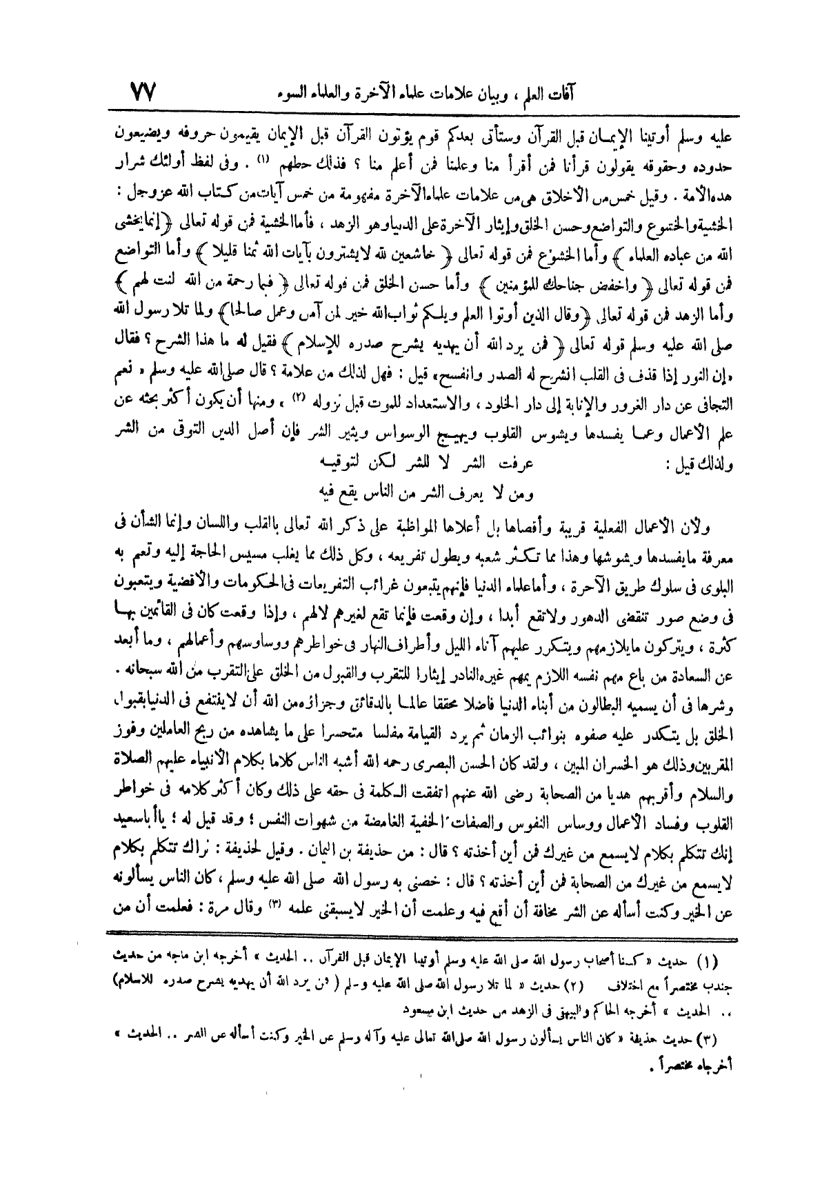 وقيل خمس من الأخلاق هي من علامات علماء الآخرة مفهومة من خمس آيات من كتاب الله عز وجل الخشية والخشوع والتواضع وحسن الخلق وإيثار الآخرة على الدنيا وهو الزهد فأما الخشية فمن قوله تَعَالَى إِنَّمَا يَخْشَى اللَّهَ مِنْ عِبَادِهِ الْعُلَمَاءُ وأما الخشوع فمن قوله تعالى خاشعين لله لا يشترون بآيات الله ثمناً قليلاً وأما التواضع فمن قوله تعالى واخفض جناحك للمؤمنين وأما حسن الخلق فمن قوله تَعَالَى فَبِمَا رَحْمَةٍ مِنَ اللَّهِ لِنْتَ لَهُمْ وأما الزهد فمن قوله تعالى وقال الذين أوتوا العلم ويلكم ثواب الله خير لمن آمن وعمل صالحاً ولما تلا رسول الله صلى الله عليه وسلم قوله تعالى فمن يرد الله أن يهديه يشرح صدره للإسلام فقيل له ما هذا الشرح فقال إن النور إذا قذف في القلب انشرح له الصدر وانفسح قيل فهل لذلك من علامة قال صلى الله عليه وسلم نعم التجافي عن دار الغرور والإنابة إلى دار الخلود والاستعداد للموت قبل نزوله (¬2) ومنها أن يكون أكثر بحثه عن علم الأعمال وعما يفسدها ويشوش القلوب ويهيج الوسواس ويثير الشر فإن أصل الدين التوقي من الشر ولذلك قيل