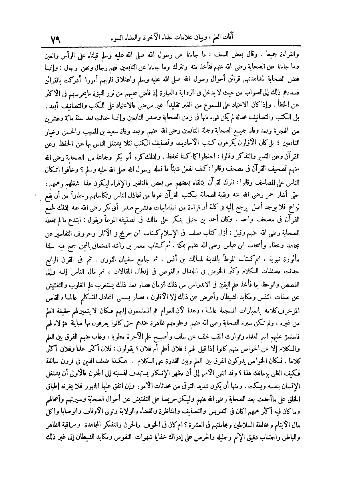ثم في القرن الرابع حدثت مصنفات الكلام وكثر الخوض في الجدال والغوص في إبطال المقالات ثم مال الناس إليه وإلى القصص والوعظ بها فأخذ علم اليقين في الاندراس من ذلك الزمان فصار بعد ذلك يستغرب علم القلوب والتفتيش عن صفات النفس ومكايد الشيطان وأعرض عن ذلك إلا الأقلون فصار يسمى المجادل المتكلم عالماً والقاص المزخرف كلامه بالعبارات المسجعة عالماً وهذا لأن العوام هم المستمعون إليهم فكان لا يتميز لهم حقيقة العلم من غيره ولم تكن سيرة الصحابة رضي الله عنهم وعلومهم ظاهرة عندهم حتى كانوا يعرفون بها مباينة هؤلاء لهم فاستمر عليهم اسم العلماء وتوارث اللقب خلف عن سلف وأصبح علم الآخرة مطوياً وغاب عنهم الفرق بين العلم والكلام إلا عن الخواص منهم كانوا إذا قيل لهم فلان أعلم أم فلان يقولون فلان أكثر علماً وفلان أكثر كلاماً