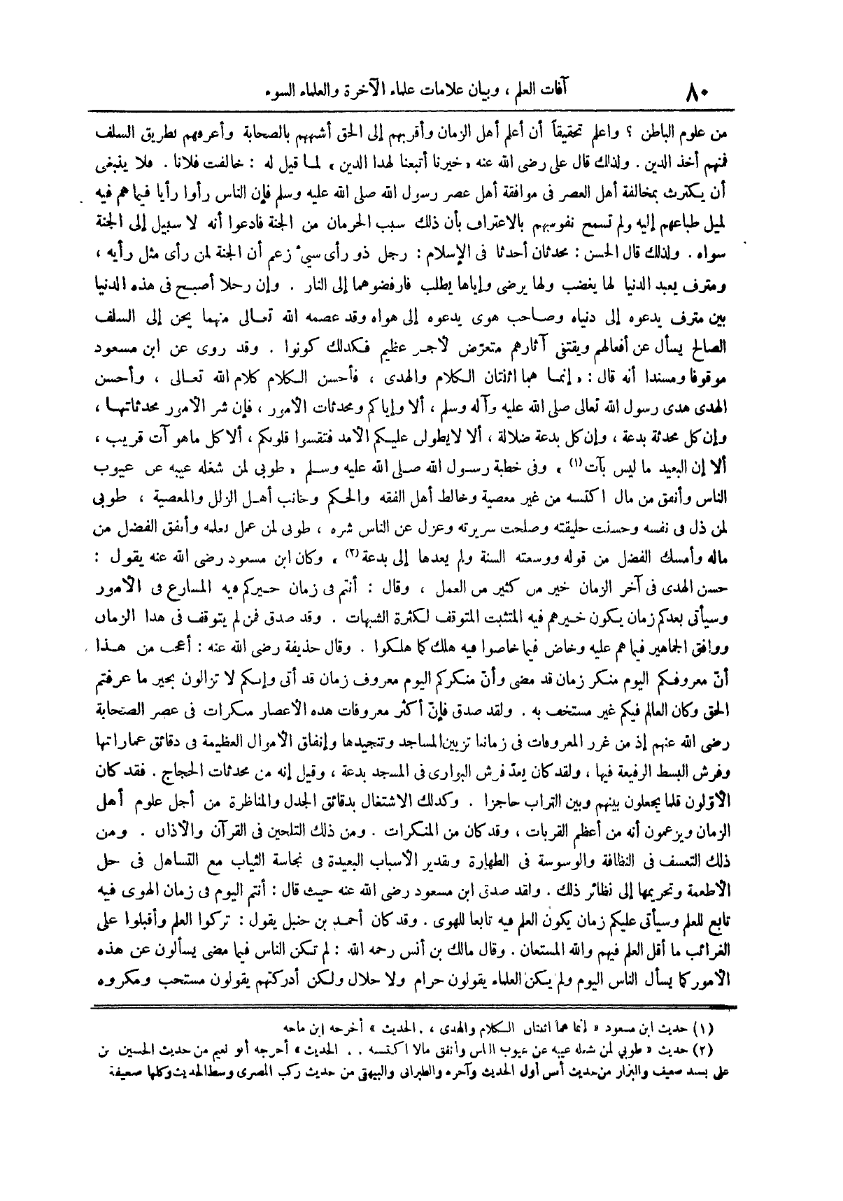 وقد روي عن ابن مسعود موقوفاً ومسنداً أنه قال إنما هما اثنتان الكلام والهدى فأحسن الكلام كلام الله تعالى وأحسن الهدى هدى رسول الله تعالى صلى الله عليه وسلم ألا وإياكم ومحدثات الأمور فإن شر الأمور محدثاتها وإن كل محدثة بدعة وإن كل بدعة ضلالة ألا لا يطولن عليكم الأمد فتقسوا قلوبكم ألا كل ما هو آت قريب ألا إن البعيد ما ليس بآت (¬1) وفي خطبة رسول الله صَلَّى اللَّهُ عَلَيْهِ وَسَلَّمَ طُوبَى لِمَنْ شَغَلَهُ عيبه عن عيوب الناس وأنفق من مال اكتسبه من غير معصية وخالط أهل الفقه والحكم وجانب أهل الزلل والمعصية طوبى لمن ذل في نفسه وحسنت خليقته وصلحت سريرته وعزل عن الناس شره طوبى لمن عمل بعلمه وأنفق الفضل من ماله وأمسك الفضل من قوله ووسعته السنة ولم يعدها إلى بدعة (¬2) وَكَانَ ابْنُ مَسْعُودٍ رَضِيَ اللَّهُ عَنْهُ يَقُولُ حسن الهدى في آخر الزمان خير من كثير من العمل وقال أنتم في زمان خيركم فيه المسارع في الأمور وسيأتي بعدكم زمان يكون خيرهم فيه المتثبت المتوقف لكثرة الشبهات