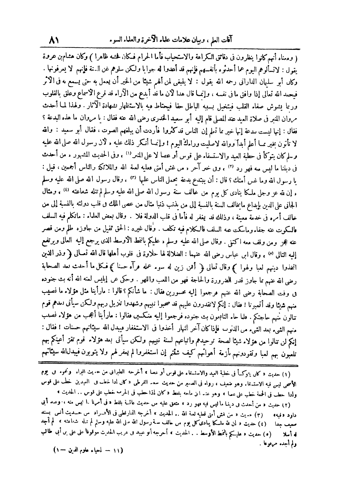 ولهذا لما أحدث مروان المنبر في صلاة العيد عند المصلى قام إليه أبو سعيد الخدري رضي الله عنه فقال يا مروان ما هذه البدعة فقال إنها ليست ببدعة إنها خير مما تعلم إن الناس قد كثروا فأردت أن يبلغهم الصوت فقال أبو سعيد والله لا تأتون بخير مما أعلم أبداً ووالله لا صليت وراءك اليوم وإنما أنكر ذلك عليه لأن رَسُولَ اللَّهِ صَلَّى اللَّهُ عَلَيْهِ وَسَلَّمَ كَانَ يتوكأ في خطبة العيد والاستسقاء على قوس أو عصا لا على المنبر (¬1) وفي الحديث المشهور من أحدث في ديننا ما ليس منه فهو رد (¬2) وفي خبر آخر من غش أمتي فعليه لعنة الله والملائكة والناس أجمعين قيل يا رسول الله وما غش أمتك قال أن يبتدع بدعة يحمل الناس عليها (¬3) وَقَالَ رَسُولُ اللَّهِ صَلَّى اللَّهُ عَلَيْهِ وَسَلَّمَ إن لله عز وجل ملكاً ينادي كل يوم من خالف سنة رسول الله صلى الله عليه وسلم لم تنله شفاعته (¬4) ومثال الجاني على الدين بإبداع ما يخالف السنة بالنسبة إلى من يذنب ذنباً مثال من عصى الملك في قلب دولته بالنسبة إلى من خالف أمره في خدمة معينة وذلك قد يغفر له فأما في قلب الدولة فلا