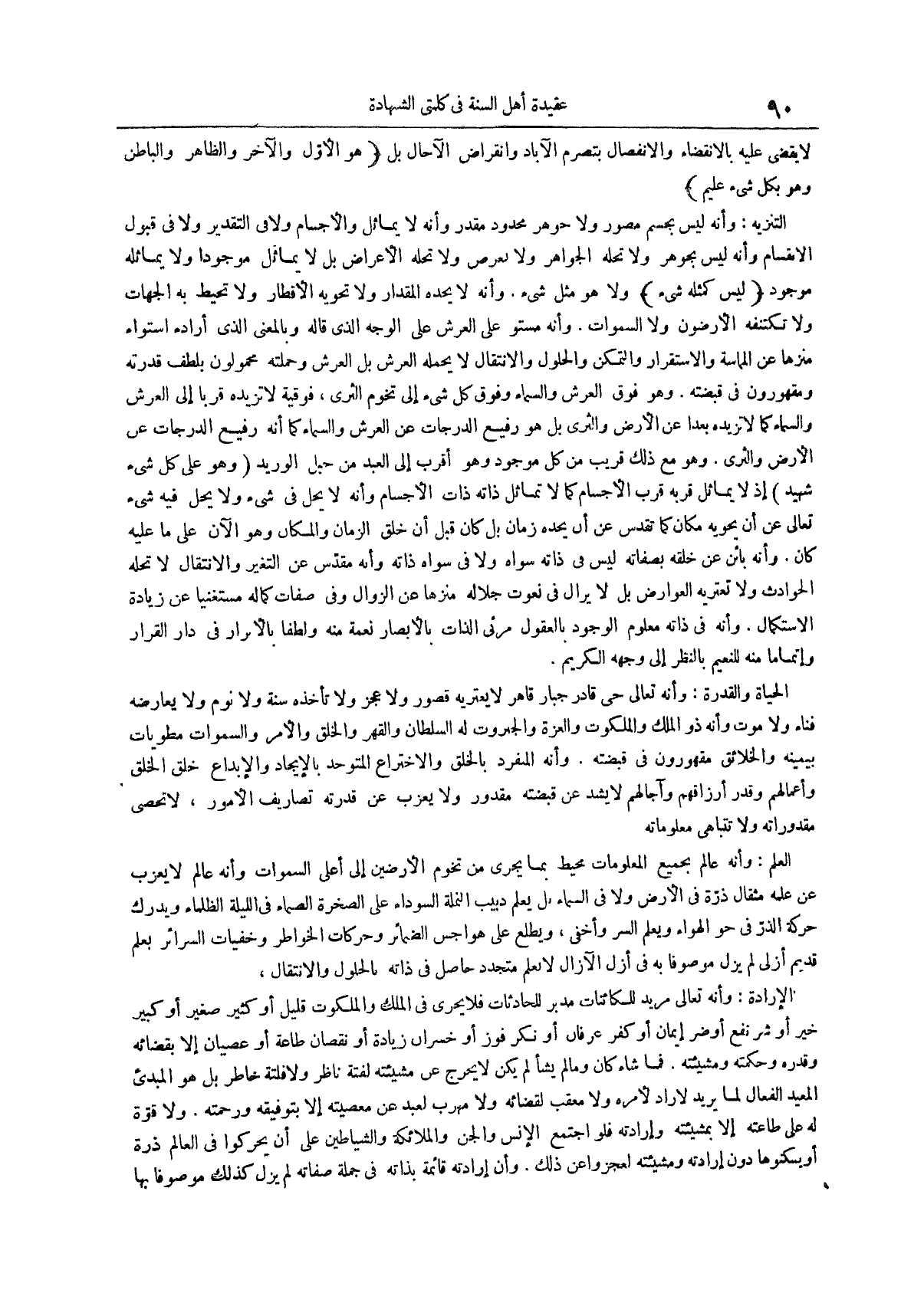 الحياة والقدرة وَأَنَّهُ تَعَالَى حَيٌّ قَادِرٌ جَبَّارٌ قَاهِرٌ لَا يَعْتَرِيهِ قُصُورٌ وَلَا عَجْزٌ وَلَا تَأْخُذُهُ سِنَةٌ وَلَا نَوْمٌ وَلَا يُعَارِضُهُ فَنَاءٌ وَلَا مَوْتٌ وأنه ذو الملك والملكوت والعزة والجبروت له السلطان والقهر والخلق والأمر والسموات مطويات بيمينه والخلائق مقهورون في قبضته