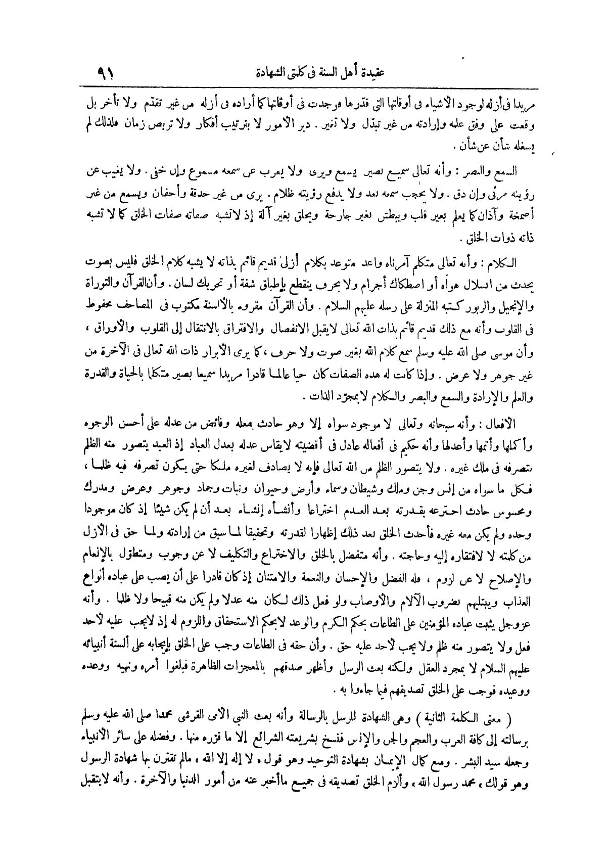 الأفعال وَأَنَّهُ سُبْحَانَهُ وَتَعَالَى لَا مَوْجُودَ سِوَاهُ إِلَّا وَهُوَ حَادِثٌ بِفِعْلِهِ وَفَائِضٌ مِنْ عَدْلِهِ عَلَى أَحْسَنِ الْوُجُوهِ وَأَكْمَلِهَا وَأَتَمِّهَا وَأَعْدَلِهَا وَأَنَّهُ حَكِيمٌ في أفعاله عادل في أقضيته لا يقاس عدله بعدل العباد إذ العبد يتصور منه الظلم بتصرفه في ملك غيره