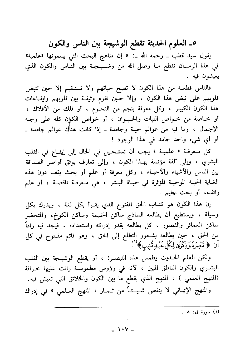 ولكن العلم الحديث يطمس هذه التبصرة، أو يقطع الوشيجة بين القلب البشري والكون الناطق المبين، لأنه في رؤوس مطموسة رانت عليها خرافة (المنهج العلمي) ، المنهج الذي يقطع ما بين الكون والخلائق التي تعيش فيه.