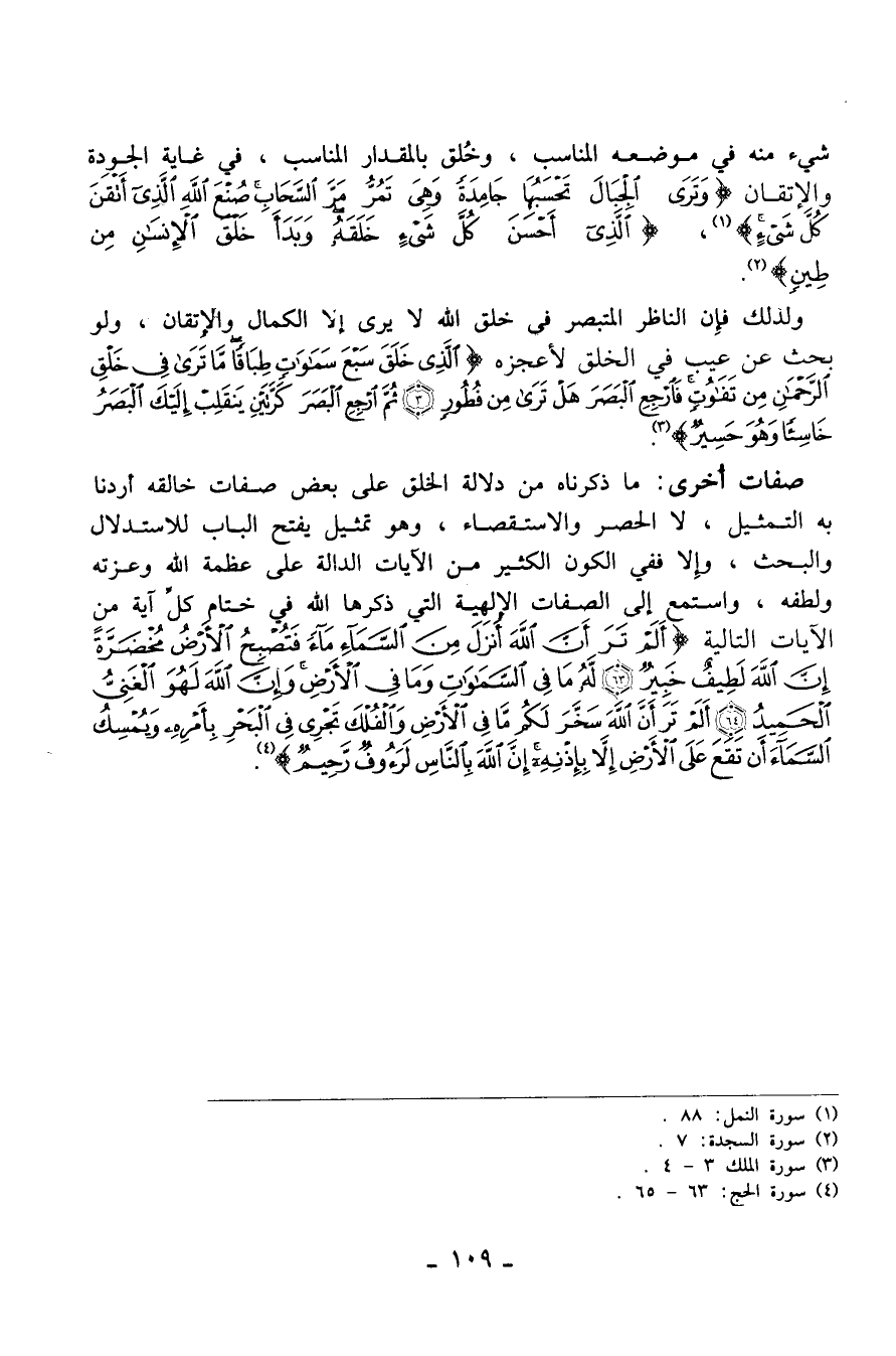 صفات أُخرى: ما ذكرناه من دلالة الخلق على بعض صفات خالقه أردنا به التمثيل، لا الحصر والاستقصاء، وهو تمثيل يفتح الباب للاستدلال والبحث، وإلا ففي الكون الكثير من الآيات الدالة على عظمة الله وعزته ولطفه، واستمع إلى الصفات الإلهية التي ذكرها الله في ختام كلّ آية من الآيات التالية (ألم تر أنَّ الله أنزل من السَّماء ماءً فتصبح الأرض مخضرَّةً إنَّ الله لطيف خبيرٌ - له ما في السَّماوات وما في الأرض وإنَّ الله لهو الغنيُّ الحميد - ألم تر أنَّ الله سخَّر لكم ما في الأرض والفلك تجري في البحر بأمره ويمسك السَّماء أن تقع على الأرض إلاَّ بإذنه إنَّ الله بالنَّاس لَرَؤُوفٌ رحيمٌ) [الحج: 63-65] .