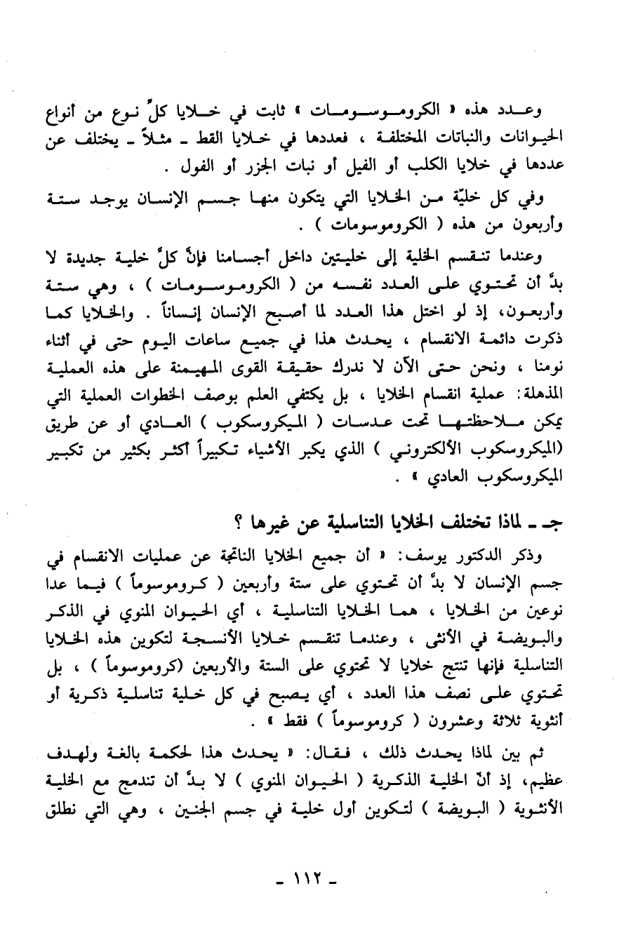 وذكر الدكتور يوسف: " أن جميع الخلايا الناتجة عن عمليات الانقسام في جسم الإنسان لا بدّ أن تحتوي على ستة وأربعين (كروموسوماً) فيما عدا نوعين من الخلايا، هما الخلايا التناسلية، أي الحيوان المنوي في الذكر والبويضة في الأنثى، وعندما تنقسم خلايا الأنسجة لتكوين هذه الخلايا التناسلية فإنها تنتج خلايا لا تحتوي على الستة والأربعين (كروموسوماً) ، بل تحتوي على نصف هذا العدد، أي يصبح في كل خلية تناسلية ذكرية أو أنثوية ثلاثة وعشرون (كروموسوماً) فقط ".