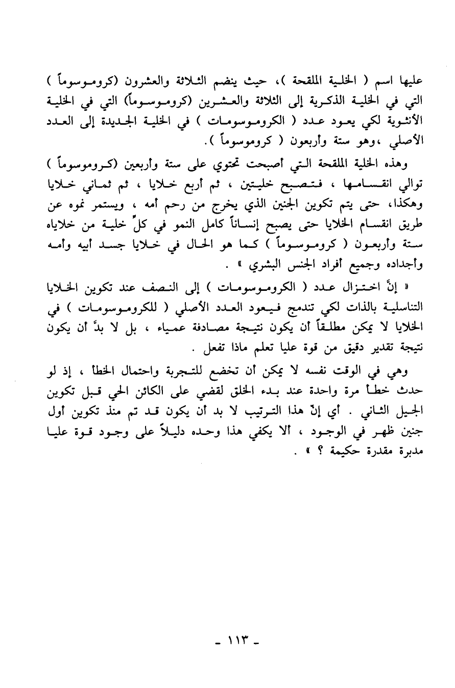 " إنَّ اختزال عدد (الكروموسومات) إلى النصف عند تكوين الخلايا التناسلية بالذات لكي تندمج فيعود العدد الأصلي (للكروموسومات) في الخلايا لا يمكن مطلقاً أن يكون نتيجة مصادفة عمياء، بل لا بدّ أن يكون نتيجة تقدير دقيق من قوة عليا تعلم ماذا تفعل.