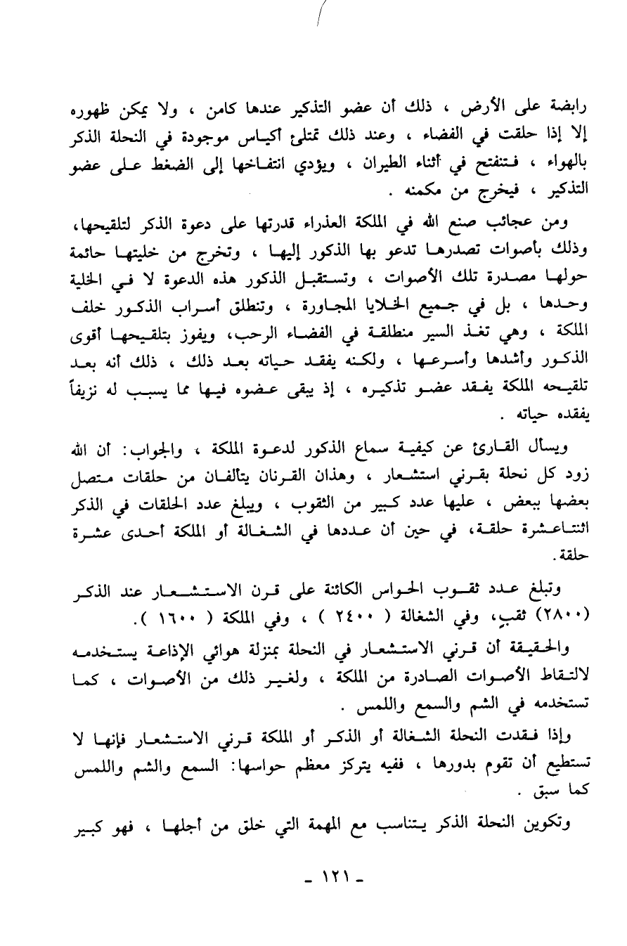 ويسأل القارئ عن كيفية سماع الذكور لدعوة الملكة، والجواب: أن الله زود كل نحلة بقرني استشعار، وهذان القرنان يتألفان من حلقات متصل بعضها ببعض، عليها عدد كبير من الثقوب، ويبلغ عدد الحلقات في الذكر اثنتا عشرة حلقة، في حين أن عددها في الشغالة أو الملكة إحدى عشرة حلقة.