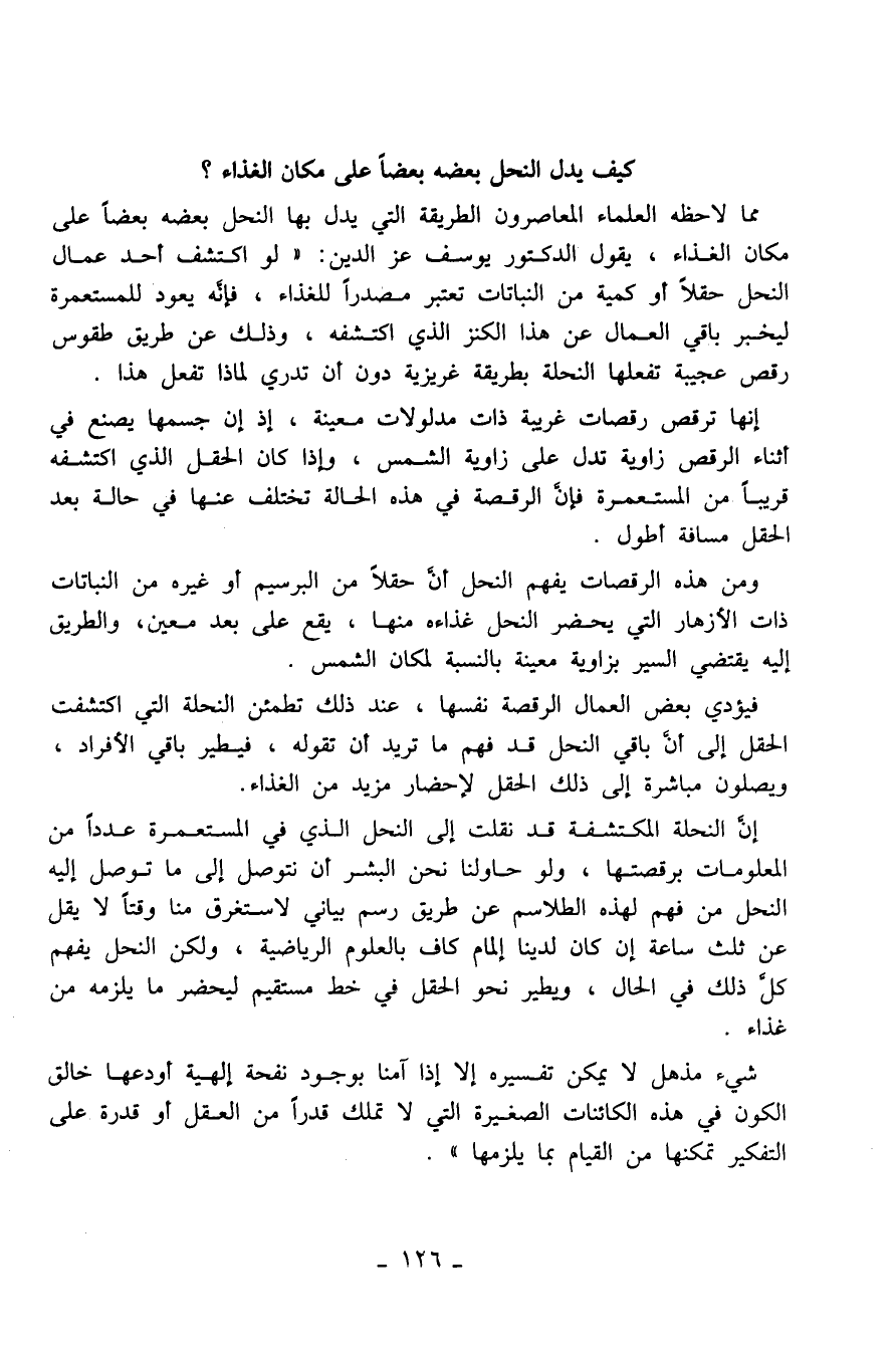 مما لاحظه العلماء المعاصرون الطريقة التي يدل بها النحل بعضه بعضاً على مكان الغذاء، يقول الدكتور يوسف عز الدين: " لو اكتشف أحد عمال النحل حقلاً أو كمية من النباتات تعتبر مصدراً للغذاء، فإنّه يعود للمستعمرة ليخبر باقي العمال، عن هذا الكنز الذي اكتشفه، وذلك عن طريق طقوس رقص عجيبة تفعلها النحلة بطريقة غريزية دون أن تدري لماذا تفعل هذا.