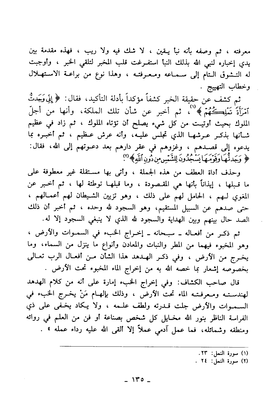 ثم كشف عن حقيقة الخبر كشفاً مؤكداً بأدلة التأكيد، فقال: (إنّي وجدت امرأةً تملكهم) [النمل: 23] ، ثم أخبر عن شأن تلك الملكة، وأنها من أجلّ الملوك بحث أوتيت من كل شيء يصلح أن تؤتاه الملوك، ثم زاد في عظيم شأنها بذكر عرشها الذي تجلس عليه، وأنه عرش عظيم، ثم أخبره بما يدعوه إلى قصدهم، وغزوهم في عقر دارهم بعد دعوتهم إلى الله، فقال: (وجدتُّها وقومها يسجدون للشَّمس من دون الله) [النمل: 24] .